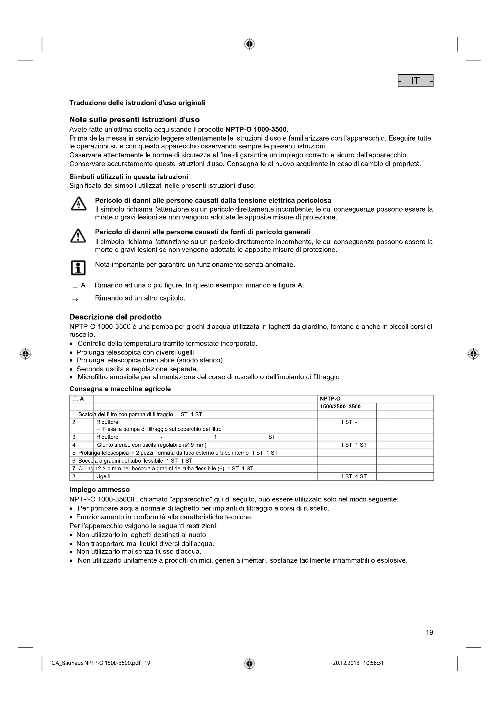 GA_Bauhaus NPTP-O 1500-3500.pdf 18 20.12.2013 10:58:3119 - IT - Traduzione delle istruzioni d'uso originali Note sulle presenti istruzioni d'uso Avete fatto un'ottima scelta acquistando il prodotto NPTP-O 1000-3500. Prima della messa in servizio leggere attentamente le istruzioni d'uso e familiarizzare con l'apparecchio. Eseguire tutte le operazioni su e con questo apparecchio osservando sempre le presenti istruzioni. Osservare attentamente le norme di sicurezza al fine di garantire un impiego corretto e sicuro dell'apparecchio. Conservare accuratamente queste istruzioni d'uso. Consegnarle al nuovo acquirente in caso di cambio di proprietà. Simboli utilizzati in queste istruzioni Significato dei simboli utilizzati nelle presenti istruzioni d'uso: