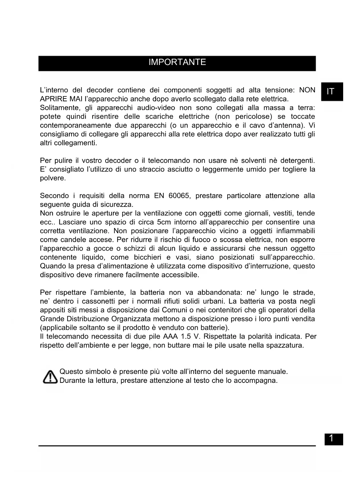 L'interno del decoder contiene dei componenti soggetti ad alta tensione: NON APRIRE MAI l'apparecchioancheafterlo averlo scollegato alla rete elettrica.