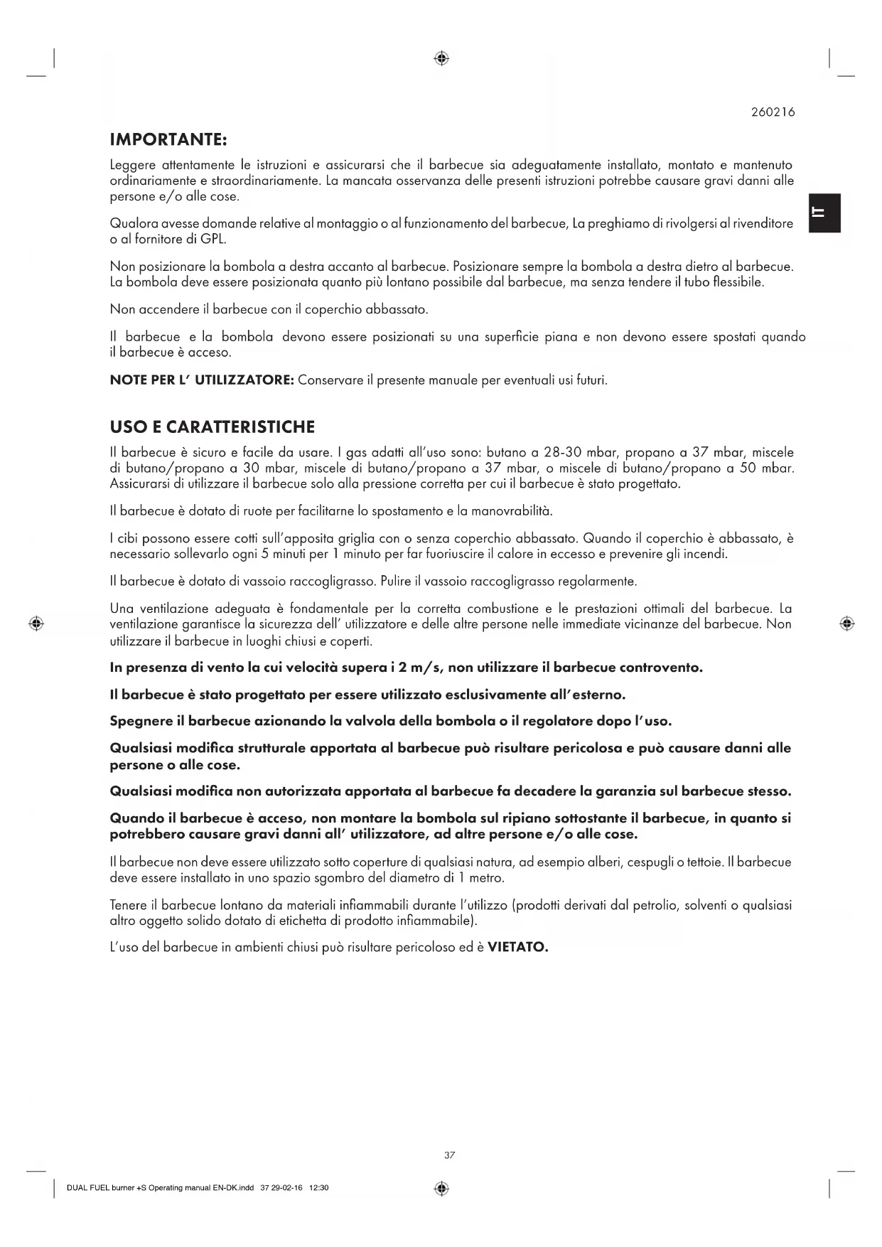 sia chiusa. Nota: per garantire una corretta ventilazione, eliminare la cenere accumulata sul fondo del barbecue se presente (solo dopo che le braci si sono spente del tutto). La carbonella richiede ossigeno per bruciare, quindi accertarsi che nulla ostruisca le bocchette d’aerazione. 2. Se si utilizzano bricchetti di carbone o pezzi di legno, formare una piramide e irrorarla con il liquido accendifuoco. Quantità massima raccomandata di bricchetti di carbone: 30 pezzi. Peso massimo del carbone: 2,5kg. Attendere che il liquido si sia impregnato di prima di accendere. Il liquido accendifuoco deve essere sigillato subito dopo l’uso DUAL FUEL burner +S Operating manual EN-DK.indd 42 29-02-16 12:3043