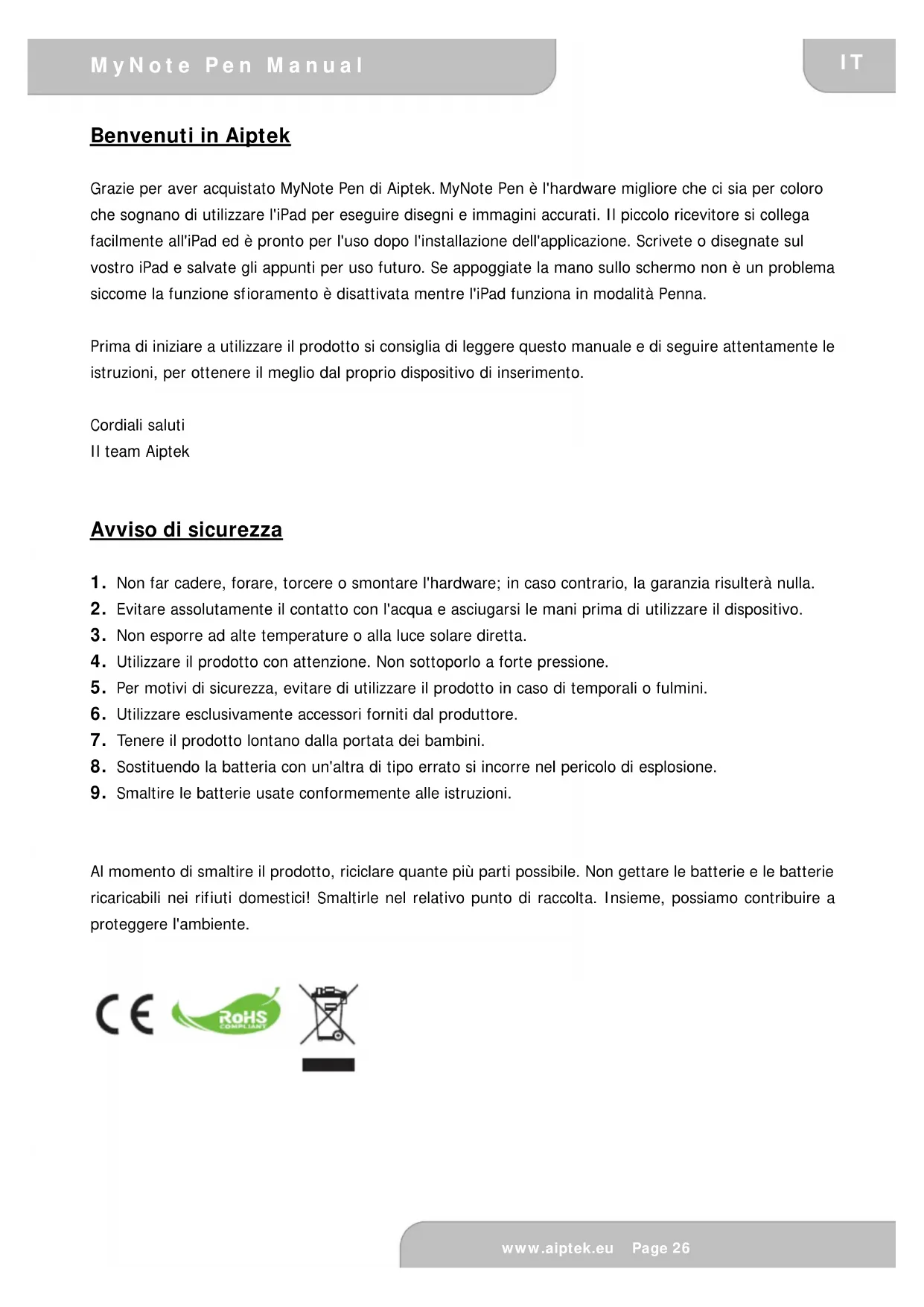 Garanzia Fare riferimento alla scheda di garanzia allegata a MyNote Bluetooth per ulteriori dettagli riguardo alla normativa locale in materia di garanzia, all’assistenza Aiptek e al centro clienti del proprio paese.