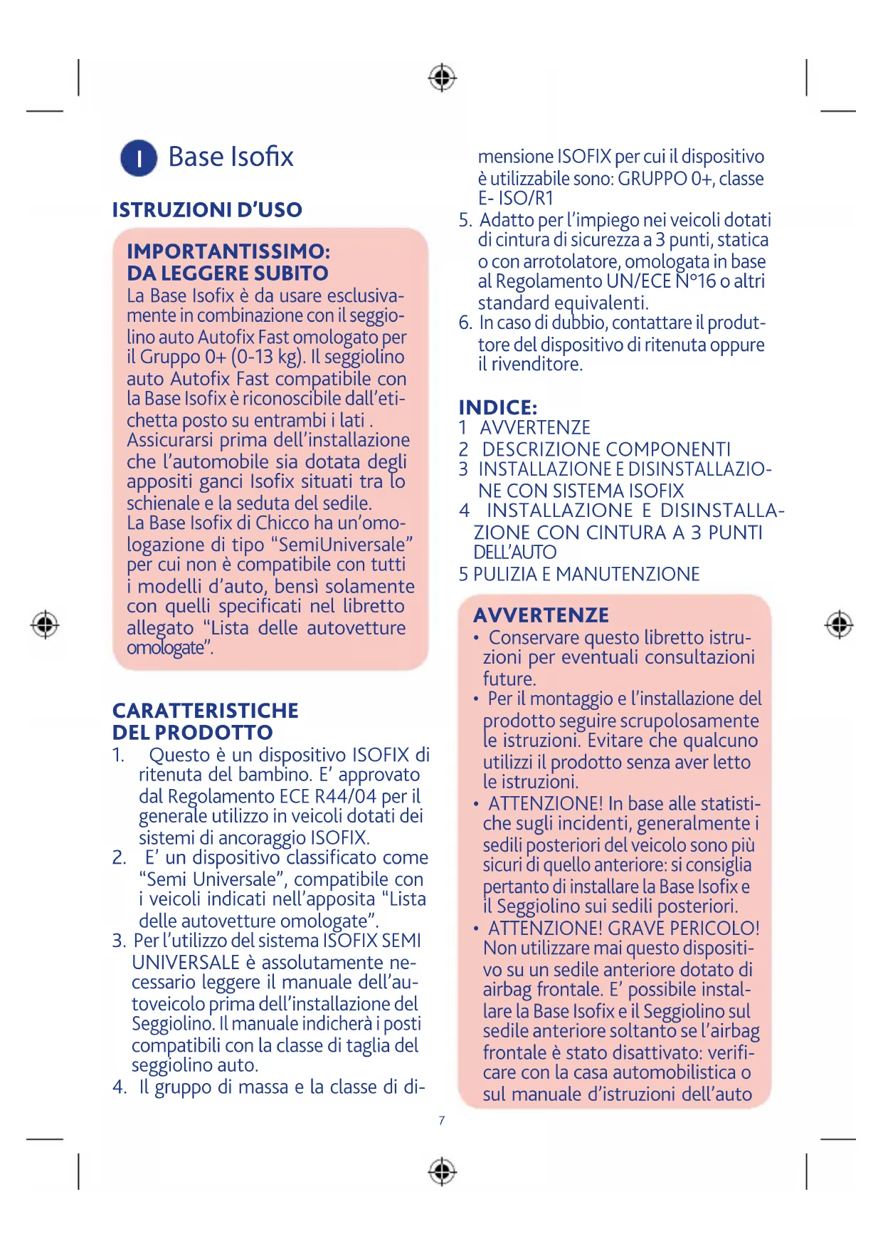 La Base Isofix è da usare esclusiva- mente in combinazione con il seggio- lino auto Autofix Fast omologato per il Gruppo 0+ (0-13 kg). Il seggiolino auto Autofix Fast compatibile con la Base Isofix è riconoscibile dall’eti- chetta posto su entrambi i lati . Assicurarsi prima dell’installazione che l’automobile sia dotata degli appositi ganci Isofix situati tra lo schienale e la seduta del sedile. La Base Isofix di Chicco ha un’omo- logazione di tipo “SemiUniversale” per cui non è compatibile con tutti i modelli d’auto, bensì solamente con quelli specificati nel libretto allegato “Lista delle autovetture omologate”. CARATTERISTICHE DEL PRODOTTO