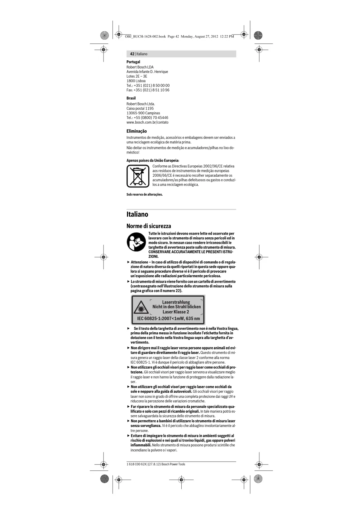 ZIONI. f Attenzione – In caso di utilizzo di dispositivi di comando o di regola- zione di natura diversa da quelli riportati in questa sede oppure qua- lora si seguano procedure diverse vi è il pericolo di provocare un’esposizione alle radiazioni particolarmente pericolosa. f Lo strumento di misura viene fornito con un cartello di avvertimento (contrassegnato nell’illustrazione dello strumento di misura sulla pagina grafica con il numero 22). f Se il testo della targhetta di avvertimento non è nella Vostra lingua, prima della prima messa in funzione incollate l’etichetta fornita in dotazione con il testo nella Vostra lingua sopra alla targhetta d’av- vertimento. f Non dirigere mai il raggio laser verso persone oppure animali ed evi- tare di guardare direttamente il raggio laser. Questo strumento di mi- sura genera un raggio laser della classe laser 2 conforme alla norma IEC 60825-1. Vi è dunque il pericolo di abbagliare altre persone. f Non utilizzare gli occhiali visori per raggio laser come occhiali di pro- tezione. Gli occhiali visori per raggio laser servono a visualizzare meglio il raggio laser e non hanno la funzione di proteggere dalla radiazione la- ser. f Non utilizzare gli occhiali visori per raggio laser come occhiali da sole e neppure alla guida di autoveicoli. Gli occhiali visori per raggio laser non sono in grado di offrire una completa protezione dai raggi UV e riducono la percezione delle variazioni cromatiche. f Far riparare lo strumento di misura da personale specializzato qua- lificato e solo con pezzi di ricambio originali. In tale maniera potrà es- sere salvaguardata la sicurezza dello strumento di misura. f Non permettere a bambini di utilizzare lo strumento di misura laser senza sorveglianza. Vi è il pericolo che abbaglino involontariamente al- tre persone. f Evitare di impiegare lo strumento di misura in ambienti soggetti al rischio di esplosioni e nei quali si trovino liquidi, gas oppure polveri infiammabili. Nello strumento di misura possono prodursi scintille che incendiano la polvere o i vapori. IEC 60825-1:2007<1mW, 635 nm Laserstrahlung Nicht in den Strahl blicken Laser Klasse 2 OBJ_BUCH-1628-002.book Page 42 Monday, August 27, 2012 12:22 PMItaliano | 43 Bosch Power Tools 1 618 C00 62X | (27.8.12) Non portare lo strumento di misura in prossimità di pace-maker. Tramite il magnete 14 viene generato un campo che può pregiudicare il funzionamento di pace- maker. f Tenere lo strumento di misura lontano da supporti magnetici di dati e da apparecchi sensibili ai magneti. A causa dell’azione del magnete 14 possono verificarsi perdite irreversibili di dati. Descrizione del prodotto e caratteristiche Si prega di aprire il risvolto di copertina su cui si trova raffigurato schemati- camente lo strumento di misura e lasciarlo aperto mentre si legge il manuale delle Istruzioni per l’uso. Uso conforme alle norme Lo strumento di misura è idoneo per la misurazione precisa ed il trasferi- mento di inclinazioni. Lo strumento di misura è ottimizzato per l’impiego in ambienti interni. Componenti illustrati La numerazione dei componenti si riferisce all’illustrazione dello strumento di misura che si trova sulla pagina con la rappresentazione grafica. 1 Tasto segnale acustico 2 Tasto di accensione/spegnimento misurazione dell’inclinazione/display 3 Tasto modifica punto zero «Alt 0°» 4 Tasto calibrazione/Aumento del valore indicato «CAL» 5 Tasto cambio unità di misura/Riduzione del valore indicato «° / %/ mm/m» 6 Tasto «Hold/Copy» 7 Coperchio del vano batterie misurazione dell’inclinazione 8 Tasto per estrazione del piedino di livellamento 9 Vite di regolazione del piedino di livellamento 10 Interruttore per rientro del piedino di livellamento 11 Display 12 Livella orizzontale 13 Livella verticale 14 Magneti 15 Passaggio per la cinghia 16 Piedino di appoggio 17 Piedino di livellamento 18 Attacco treppiede 1/4" 19 Tasto di accensione/spegnimento laser 20 Coperchio del vano batterie laser 21 Uscita del raggio laser 22 Targhetta di indicazione di pericolo del raggio laser 23 Numero di serie 24 Astuccio di protezione 25 Cinghia di fissaggio 26 Treppiede*
