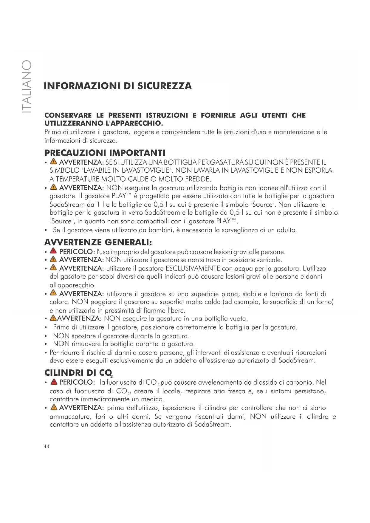 CONSERVARE LE PRESENTI ISTRUZIONI E FORNIRLE AGLI UTENTI CHE UTILIZZERANNO L'APPARECCHIO. Prima di utilizzare il gasatore, leggere e comprendere tutte le istruzioni d'uso e manutenzione e le informazioni di sicurezza. PRECAUZIONI IMPORTANTI AVVERTENZA: SE SI UTILIZZA UNA BOTTIGLIA PER GASATURA SU CUI NON È PRESENTE IL SIMBOLO "LAVABILE IN LAVASTOVIGLIE", NON LAVARLA IN LAVASTOVIGLIE E NON ESPORLA A TEMPERATURE MOLTO CALDE O MOLTO FREDDE. AVVERTENZA: NON eseguire la gasatura utilizzando bottiglie non idonee all'utilizzo con il gasatore. Il gasatore PLAY™ è progettato per essere utilizzato con tutte le bottiglie per la gasatura SodaStream da 1 l e le bottiglie da 0,5 l su cui è presente il simbolo "Source". Non utilizzare le bottiglie per la gasatura in vetro SodaStream e le bottiglie da 0,5 l su cui non è presente il simbolo "Source", in quanto non sono compatibili con il gasatore PLAY™. Se il gasatore viene utilizzato da bambini, è necessaria la sorveglianza di un adulto. AVVERTENZE GENERALI: PERICOLO: l'uso improprio del gasatore può causare lesioni gravi alle persone. AVVERTENZA: NON utilizzare il gasatore se non si trova in posizione verticale. AVVERTENZA: utilizzare il gasatore ESCLUSIVAMENTE con acqua per la gasatura. L'utilizzo del gasatore per scopi diversi da quelli indicati può causare lesioni gravi alle persone e danni all'apparecchio. AVVERTENZA: utilizzare il gasatore su una superficie piana, stabile e lontano da fonti di calore. NON poggiare il gasatore su superfici molto calde (ad esempio, la superficie di un forno) e non utilizzarlo in prossimità di fiamme libere. AVVERTENZA: NON eseguire la gasatura in una bottiglia vuota. Prima di utilizzare il gasatore, posizionare correttamente la bottiglia per la gasatura. NON spostare il gasatore durante la gasatura. NON rimuovere la bottiglia durante la gasatura. Per ridurre il rischio di danni a cose o persone, gli interventi di assistenza o eventuali riparazioni devo essere eseguiti esclusivamente da un addetto all'assistenza autorizzato di SodaStream.