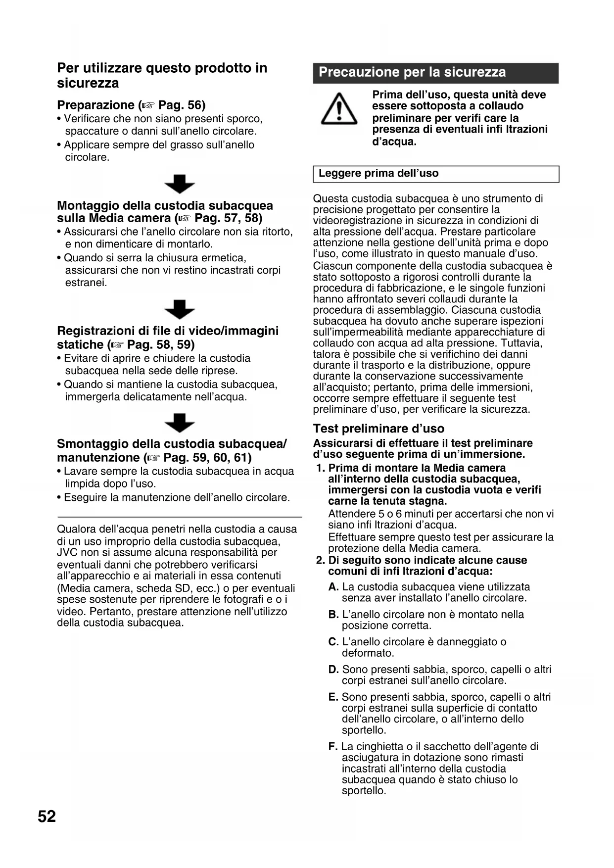 subacquea, verifi care che quest’ultima non presenti graffi o spaccature. La custodia subacquea deve sopportare la pressione dell’acqua durante l’uso. Un’esposizione ripetuta alla pressione eventualmente porta all’usura dei materiali, che potrebbe produrre dei danni alla custodia subacquea. Prima di utilizzare la custodia subacquea, controllare che non siano presenti graffi o spaccature. Se si utilizza la custodia subacquea frequentemente, assicurarsi di sottoporla a manutenzione presso il punto di acquisto. (La manutenzione è a pagamento.) Per proteggere la Media camera ed assicurare un’utilizzo ottimale, tenere presenti gli esempi elencati sopra quando si utilizza la custodia subacquea. JVC non si assume alcuna responsabilità per infiltrazioni d’acqua o danni a qualsiasi oggetto contenuto all’interno della custodia subacquea (Media camera, scheda SD, ecc.) dovuti ad uso improprio diquesto prodotto. Assicurarsi di seguire le procedure corrette quando si utilizza la custodia subacquea.