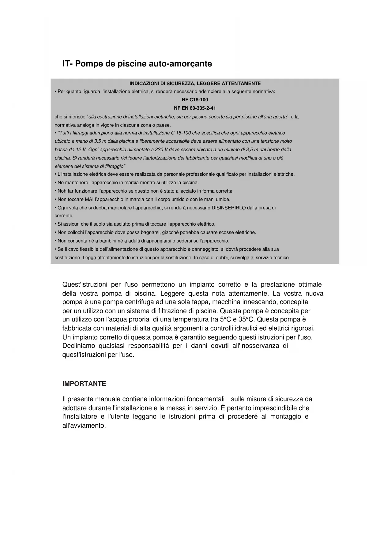 lla vostra pompa di piscina. Leggere questa nota attentamente. La vostra nuova pompa è una pompa centrifuga ad una sola tappa, macchina innescando, concepita per un utilizzo con un sistema di filtrazione di piscina. Questa pompa è concepita per un utilizzo con l'acqua propria di una temperatura tra 5°C e 35°C. Questa pompa è fabbricata con materiali di alta qualità argomenti a controlli idraulici ed elettrici rigorosi. Un impianto corretto di questa pompa è garantito seguendo questi istruzioni per l'uso. Decliniamo qualsiasi responsabilità per i danni dovuti all'inosservanza di quest'istruzioni per l'uso. IMPORTANTE Il presente manuale contiene informazioni fondamentali sulle misure di sicurezza da adottare durante l'installazione e la messa in servizio. È pertanto imprescindibile che l'installatore e l'utente leggano le istruzioni prima di procederé al montaggio e all'avviamento.