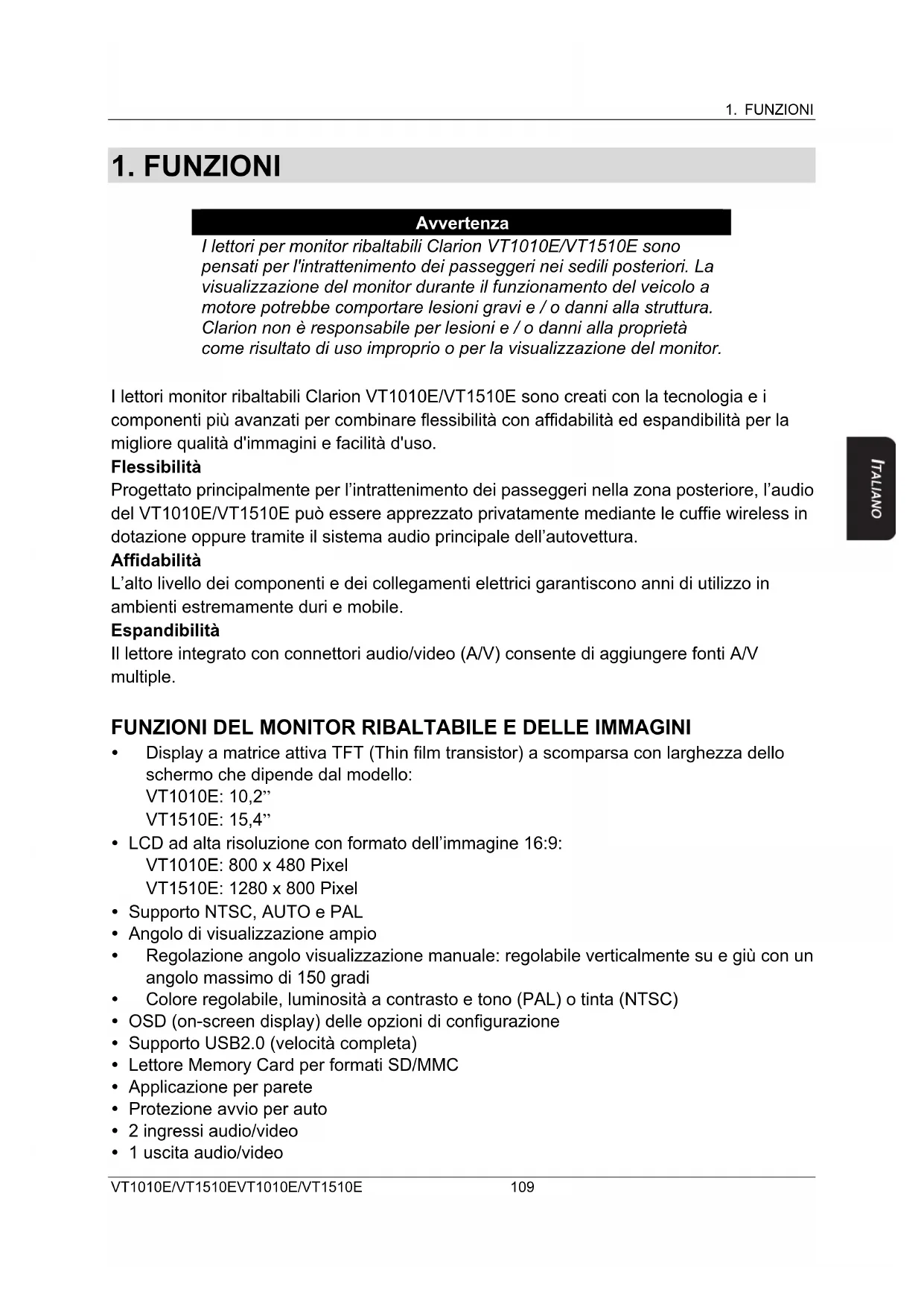 Avvertenza I lettori per monitor ribaltabili Clarion VT1010E/VT1510E sono pensati per l'intrattenimento dei passeggeri nei sedili posteriori. La visualizzazione del monitor durante il funzionamento del veicolo a motore potrebbe comportare lesioni gravi e / o danni alla struttura. Clarion non è responsabile per lesioni e / o danni alla proprietà come risultato di uso improprio o per la visualizzazione del monitor. I lettori monitor ribaltabili Clarion VT1010E/VT1510E sono creati con la tecnologia e i componenti più avanzati per combinare flessibilità con affidabilità ed espandibilità per la migliore qualità d'immagini e facilità d'uso. Flessibilità Progettato principalmente per l’intrattenimento dei passeggeri nella zona posteriore, l’audio del VT1010E/VT1510E può essere apprezzato privatamente mediante le cuffie wireless in dotazione oppure tramite il sistema audio principale dell’autovettura. Affidabilità L’alto livello dei componenti e dei collegamenti elettrici garantiscono anni di utilizzo in ambienti estremamente duri e mobile. Espandibilità Il lettore integrato con connettori audio/video (A/V) consente di aggiungere fonti A/V multiple. FUNZIONI DEL MONITOR RIBALTABILE E DELLE IMMAGINI Display a matrice attiva TFT (Thin film transistor) a scomparsa con larghezza dello schermo che dipende dal modello: VT1010E: 10,2” VT1510E: 15,4” LCD ad alta risoluzione con formato dell’immagine 16:9: VT1010E: 800 x 480 Pixel VT1510E: 1280 x 800 Pixel Supporto NTSC, AUTO e PAL Angolo di visualizzazione ampio Regolazione angolo visualizzazione manuale: regolabile verticalmente su e giù con un angolo massimo di 150 gradi Colore regolabile, luminosità a contrasto e tono (PAL) o tinta (NTSC) OSD (on-screen display) delle opzioni di configurazione Supporto USB2.0 (velocità completa) Lettore Memory Card per formati SD/MMC Applicazione per parete Protezione avvio per auto 2 ingressi audio/video 1 uscita audio/video1. FUNZIONI 110 VT1010E/VT1510E Luce a cupola a LED bianca Trasmettitore IR integrato per cuffie wireless Telecomando IR wireless Lettore DVD con passaggio con supporto multiformato Capacità di lettura: DVD /DVD±R /DVD±RW /CD-DA /CD-RW/MP3 /WMA /VCD /SVCD /DivX Nota: CD multisessione e file WMA da 320 kbp non possono essere visualizzati con questo lettore.. Ingresso audio/video da 3,5 mm