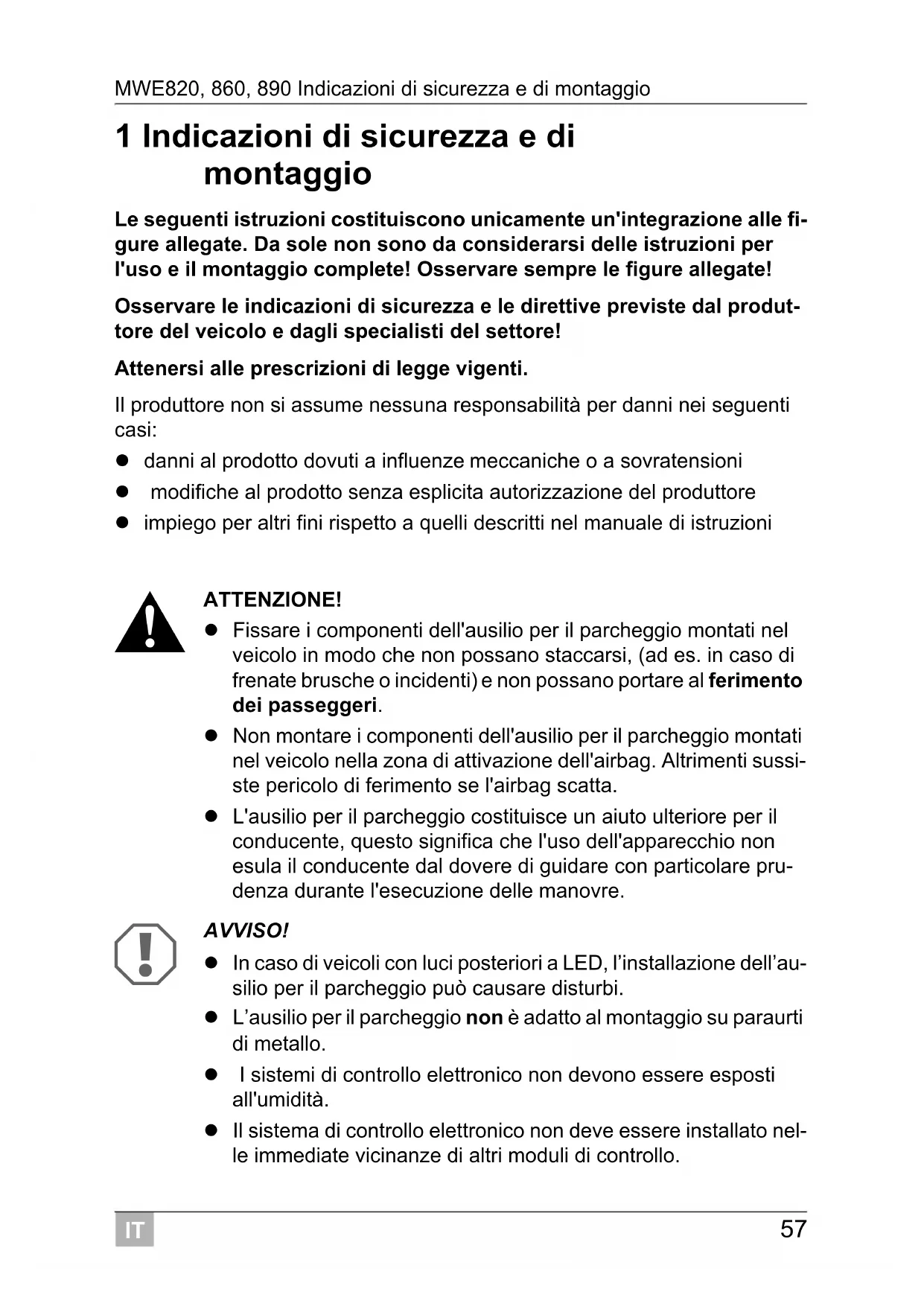 ATTENZIONE! Fissare i componenti dell'ausilio per il parcheggio montati nel veicolo in modo che non possano staccarsi, (ad es. in caso di frenate brusche o incidenti) e non possano portare al ferimento dei passeggeri. Non montare i componenti dell'ausilio per il parcheggio montati nel veicolo nella zona di attivazione dell'airbag. Altrimenti sussi- ste pericolo di ferimento se l'airbag scatta. L'ausilio per il parcheggio costituisce un aiuto ulteriore per il conducente, questo significa che l'uso dell'apparecchio non esula il conducente dal dovere di guidare con particolare pru- denza durante l'esecuzione delle manovre.