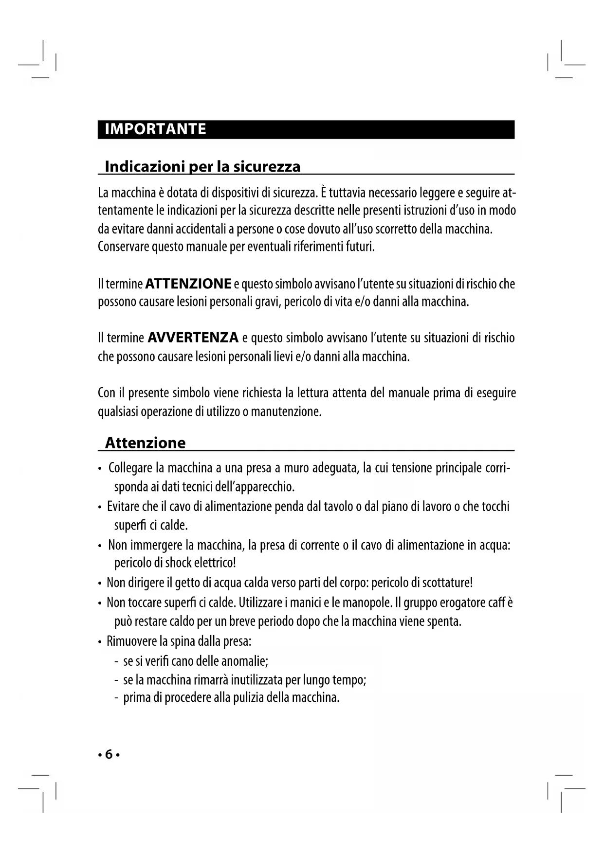 Attendere che la spia "pronto ca è" (19) si ac- cen da. Porta ltro non inserito per il preriscaldamen- to (cap. 5). Preriscaldare il porta ltro. Tazzine fredde. Preriscadare le tazzine con acqua calda. Non si forma la schiu ma del lat te. Non si riesce a preparare un cap- puccino. Latte non adatto: latte in polvere, latte magro. Utilizzare latte intero. Tubo vapore sporco. Pulire il tubo vapore come descritto nel Cap.10. Non è più presente vapore nella caldaia. Ricaricare il circuito (par. 4.5) e ripetere le opera- zioni descritte nel Cap.8. Il ca è sgorga troppo ve lo ce men- te, non si forma la crema. Troppo poco ca è nel porta ltro. Aggiungere il ca è (cap. 5). Macinatura trop po grossa. Usare una miscela diversa (cap.6). Ca è vecchio o non adatto. Usare una mi sce la diversa (cap.6). Il ca è non sgorga o sgor ga solo a gocce. Mancanza di acqua. Rabboccare con acqua e ricaricare il circuito (par. 4.5). Macinatura trop po ne. Usare una miscela diversa (cap.6). Ca è premuto nel porta ltro. Smuovere il ca è macinato. Troppo ca è nel porta ltro. Ridurre la quantità di ca è nel porta ltro. Pomello (3) aperto. Chiudere il pomello (3). Macchina calci cata. Decalci care la macchina (cap.11). Filtro nel porta ltro otturato. Pulire il ltro (cap.10). Il ca è sgorga dai bordi. Porta ltro inserito male nel grup po eroga- zione ca è. Inserire correttamente il porta ltro (cap.5). Bordo superiore del porta ltro sporco. Pulire il bordo del porta ltro. Troppo ca è nel porta ltro. Ridurre la quantità di ca è uti liz zan do il misu- rino. Per i guasti non con tem pla ti dalla suddetta ta bel la o in caso che i rimedi sug ge ri ti non li ri sol va no, rivolgersi ad un centro assistenza. 13 RISOLUZIONE PROBLEMI• 18 • IMPORTANT Safety Instructions This machine is equipped with safety devices. Nevertheless, read and follow the safety instructions carefully and only use the machine properly as described in these instructions to avoid accidental injury or damage due to improper use of the machine. Keep this user manual for future reference. The term WARNING and this icon warn against possible severe injuries, danger to life and/or damage to the machine. The term CAUTION and this icon warn against slight injuries and/or damage to the machine. Warning