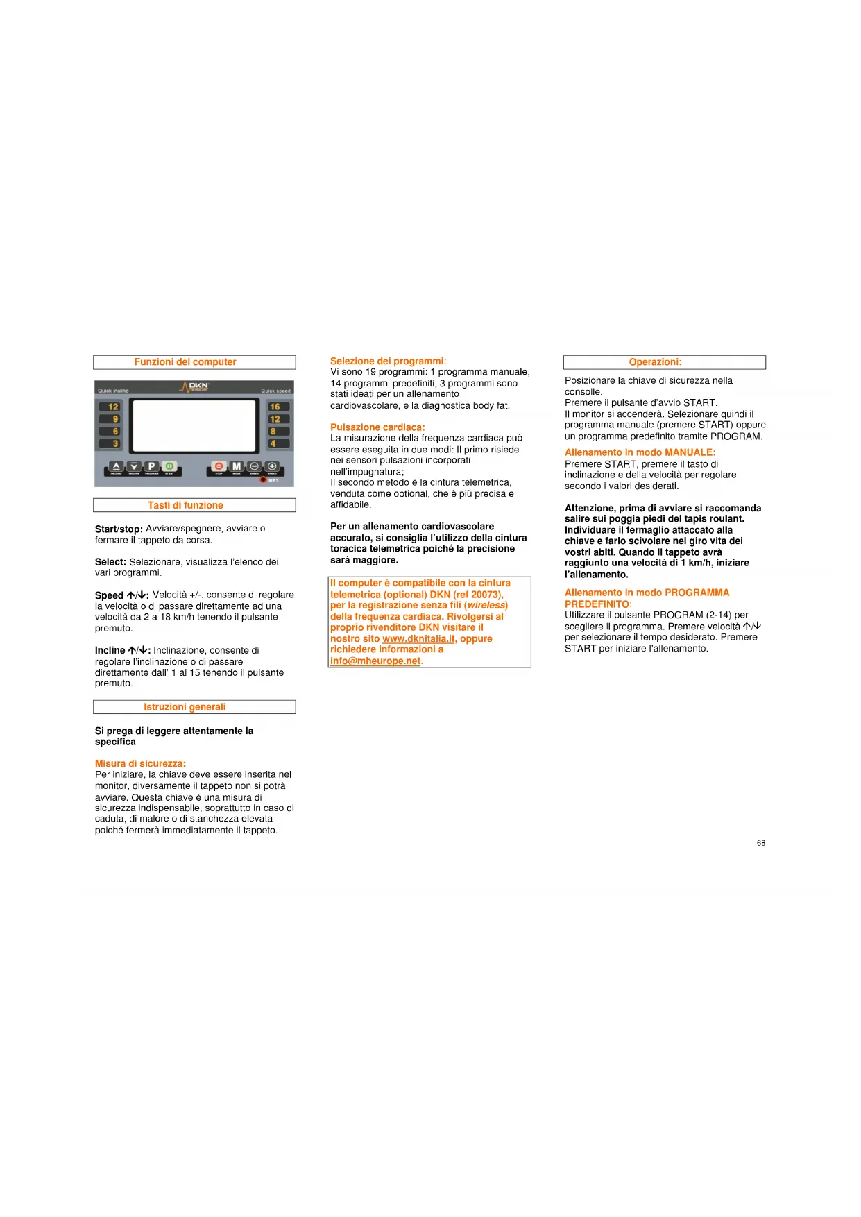 Il computer è compatible con la cintura telemetrica (optional) DKN (ref 20073), per la registrazione shame fili (wireless) della frequenza cardiaca. Rivolgersi al proprio rivenditore DKN visitare il nostro site www.dknitalia.it, oppure rchiedere Informazioni a info@mheurope.net.