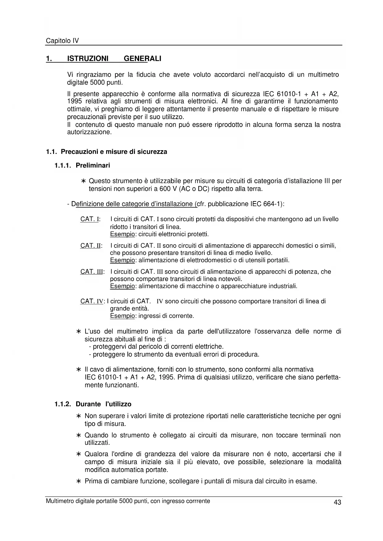 Il presente appearecchio è conforme alla normativa di sicurezza IEC 61010-1 + A1 + A2, 1995 relativàagli strumenti di misura elettronici. Al fine di garantirne il funzionamento ottimale, vi preghiamo di leggere attendamente il presente manuale e di rispettore le misure precauzionali previste per il suo utilizzo.