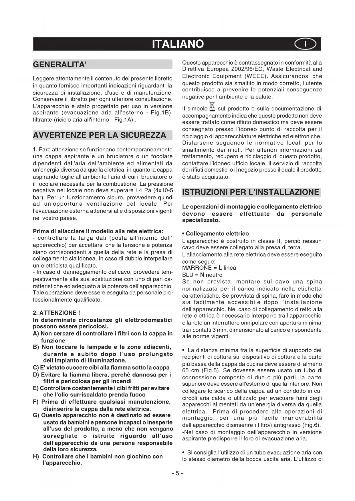 In determinate circostanze gli elettrodomestici possono essere pericolosi. A) Non cercare di controllare i filtri con la cappa in funzione B) Non toccare le lampade e le zone adiacenti, durante e subito dopo l’uso prolungato dell'impianto di illuminazione. C) E' vietato cuocere cibi alla fiamma sotto la cappa D) Evitare la fiamma libera, perchè dannosa per i filtri e pericolosa per gli incendi E) Controllare costantemente i cibi fritti per evitare che l'olio surriscaldato prenda fuoco F) Prima di effettuare qualsiasi manutenzione, disinserire la cappa dalla rete elettrica. G) Questo apparecchio non è destinato ad essere usato da bambini e persone incapaci o inesperte all’uso del prodotto, a meno che non vengano sorvegliate o istruite riguardo all’uso dell’apparecchio da una persona responsabile della loro sicurezza. H) Controllare che i bambini non giochino con l'apparecchio. Questo apparecchio è contrassegnato in conformità alla Direttiva Europea 2002/96/EC, Waste Electrical and Electronic Equipment (WEEE). Assicurandosi che questo prodotto sia smaltito in modo corretto, l’utente contribuisce a prevenire le potenziali conseguenze negative per l’ambiente e la salute. Il simbolo sul prodotto o sulla documentazione di accompagnamento indica che questo prodotto non deve essere trattato come rifiuto domestico ma deve essere consegnato presso l’idoneo punto di raccolta per il riciclaggio di apparecchiature elettriche ed elettroniche. Disfarsene seguendo le normative locali per lo smaltimento dei rifiuti. Per ulteriori informazioni sul trattamento, recupero e riciclaggio di questo prodotto, contattare l’idoneo ufficio locale, il servizio di raccolta dei rifiuti domestici o il negozio presso il quale il prodotto è stato acquistato.