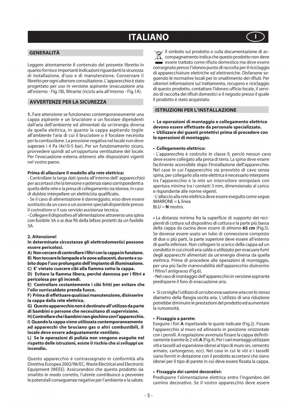 Fig.6 Fig.9 Fig.10 Fig.8 Fig.7 Fig.11 Fig.12 - 4 -GENERALITÀ Leggere attentamente il contenuto del presente libretto in quanto fornisce importanti indicazioni riguardanti la sicurezza di installazione, d’uso e di manutenzione. Conservare il libretto per ogni ulteriore consultazione. L’apparecchio è stato progettato per uso in versione aspirante (evacuazione aria all’esterno - Fig.1B), ltrante (riciclo aria all’interno - Fig.1A).