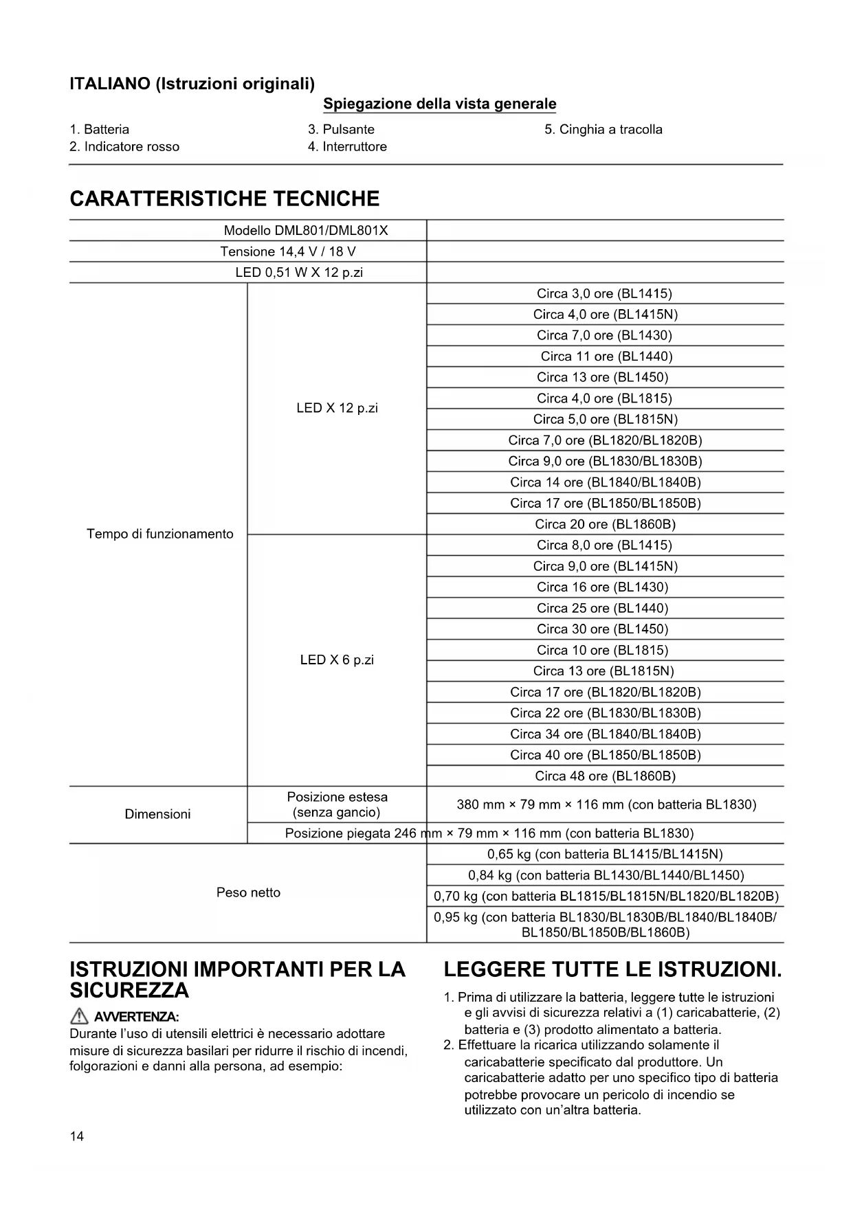 ITALIANO (Istruzioni originali) Spiegazione della vista generale CARATTERISTICHE TECNICHE