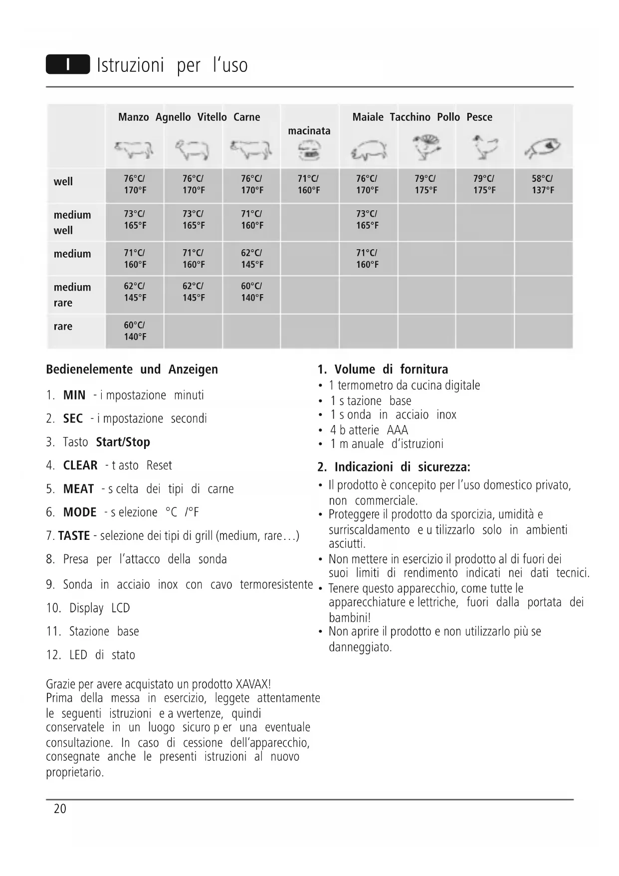 Prima di mettereinfunzione l’apparecchio, pulire la sonda sotto l’acqua corr ente utilizzando un detergente delicato. Introdurrelasonda nel punto più spesso del cibo, ad una profondità di almeno 2 cm. Soltanto la sonda eilcavo sono termoresistenti no a250°C. Estrarredelicatamente il cavo all’esterno. Il cavo si adatta alla guarnizione del forno. Tenerelastazione base eiltermometro lontano dalla fonte di calore. Non utilizzare l’apparecchio nel microonde. Nessuna parte della sonda in acciaio deve entrareacontatto con la amma viva. Utilizzabile solo per il forno eilgrill.