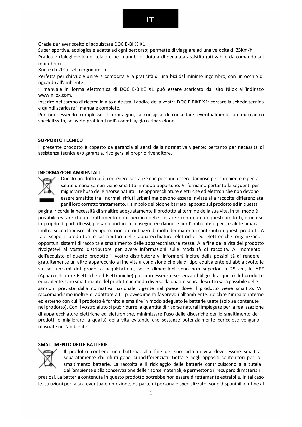 Grazie per aver scelto di acquistare DOC E-BIKE X1. Super sportiva, ecologica e adatta ad ogni percorso; permette di viaggiare ad una velocità di 25Km/h. Pratica e ripieghevole nel telaio e nel manubrio, dotata di pedalata assistita (attivabile da comando sul manubrio). Ruote da 20” e sella ergonomica. Perfetta per chi vuole unire la comodità e la praticità di una bici dal minimo ingombro, con un occhio di riguardo all’ambiente. Il manuale in forma elettronica di DOC E-BIKE X1 può essere scaricato dal sito Nilox all’indirizzo www.nilox.com. Inserire nel campo di ricerca in alto a destra il codice della vostra DOC E-BIKE X1: cercare la scheda tecnica e quindi scaricare il manuale completo. Pur non essendo complesso il montaggio, si consiglia di consultare eventualmente un meccanico specializzato, se avete problemi nell’assemblaggio o riparazione.