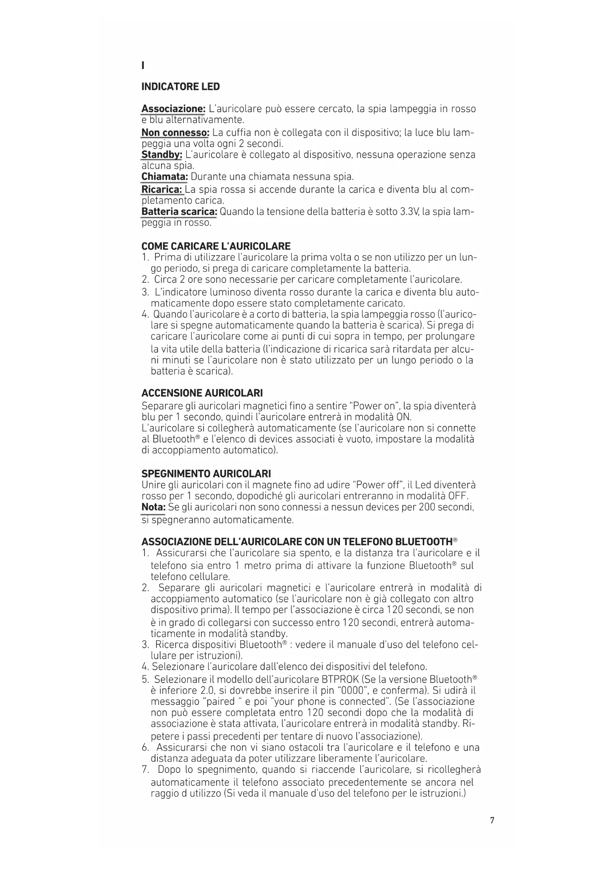 lare si spegne automaticamente quando la batteria è scarica). Si prega di caricare l’auricolare come ai punti di cui sopra in tempo, per prolungare la vita utile della batteria (l’indicazione di ricarica sarà ritardata per alcu- ni minuti se l’auricolare non è stato utilizzato per un lungo periodo o la batteria è scarica). ACCENSIONE AURICOLARI Separare gli auricolari magnetici fino a sentire “Power on”, la spia diventerà blu per 1 secondo, quindi l’auricolare entrerà in modalità ON. L’auricolare si collegherà automaticamente (se l’auricolare non si connette al Bluetooth® e l’elenco di devices associati è vuoto, impostare la modalità di accoppiamento automatico). SPEGNIMENTO AURICOLARI Unire gli auricolari con il magnete fino ad udire “Power o”, il Led diventerà rosso per 1 secondo, dopodiché gli auricolari entreranno in modalità OFF. Nota: Se gli auricolari non sono connessi a nessun devices per 200 secondi, si spegneranno automaticamente. ASSOCIAZIONE DELL’AURICOLARE CON UN TELEFONO BLUETOOTH®