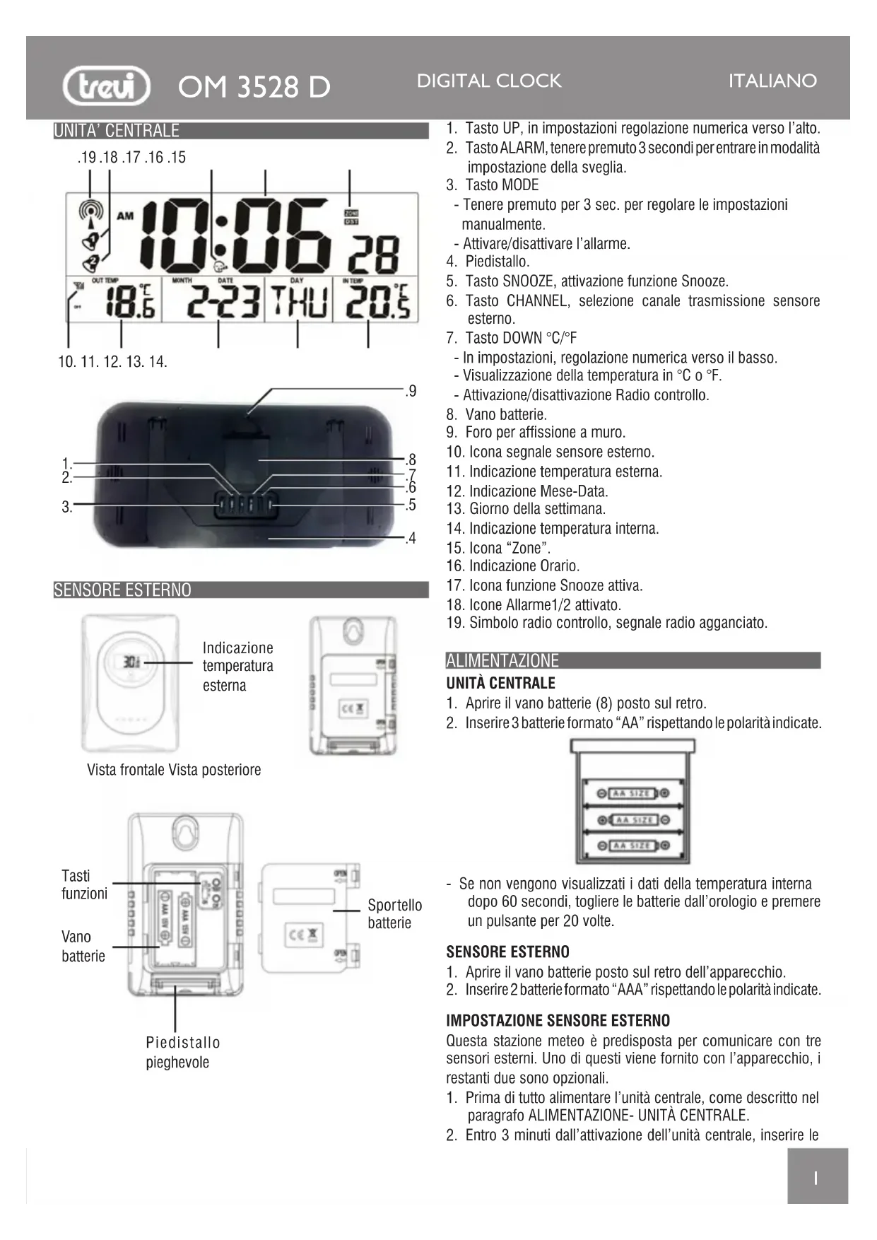 Questo orologio è progettato per essere anche appeso a muro utilizzando i fori (9). Per ottenere la massima leggibilità del display appendetelo almeno a 2 metri di altezza in modo da formare un angolo di circa 70° con l’occhio. CARATTERISTICHE TECNICHE Alimentazione:..... batterie 3x“AA”, 1,5V per l’unità principale .... batterie 2x“AAA”, 1,5V per sensore esterno Temperatura interna:........... 0°C ~ + 50°C (+32°F~+122°F) Sensore remoto:................... -20°C ~ +70°C (-4°F~+158°F) Canale:.................................................. max. 3 sensori remoti Trasmissione:..................... fino a 30 m all’aperto, RF 433 MHz Dimensioni:................................................ 420 x 200 x 30mm INFORMAZIONI AGLI UTENTI ai sensi del Decreto Legislativo N° 49 del 14 Marzo 2014 “Attuazione della Direttiva 2012/19/UE sui rifiuti di apparec- chiature elettriche ed elettroniche (RAEE)” Il simbolo del cassonetto barrato riportato sull’apparecchiatura indica che il prodotto alla fine della propria vita utile deve essere raccolto separatamente dagli altri rifiuti. L’utente dovrà, pertanto, conferire l’apparecchiatura integra dei componenti essenziali giunta a fine vita agli idonei centri di raccolta differenziata dei rifiuti elettronici ed elettrotecnici, oppure riconsegnarla al riven- ditore al momento dell’acquisto di nuova apparecchiatura di tipo equivalente, in ragione di uno a uno, oppure 1 a zero per le apparecchiature aventi lato maggiore inferiore a 25 cm. L’adeguata raccolta differenziata per l’avvio successivo dell’apparecchiatura dimessa al riciclaggio, al trattamento e allo smaltimento ambien- tale compatibile contribuisce ad evitare possibili effetti negativi sull’ambiente e sulla salute e favorisce il riciclo dei materiali di cui è composta l’apparecchiatura. Lo smaltimento abusivo del prodotto da parte dell’utente comporta l’applicazione delle sanzioni amministrative di cui al D.Lgs n. Decreto Legislativo N° 49 del 14 Marzo 2014. ITALIANOOM 3528 D DIGITAL CLOCK