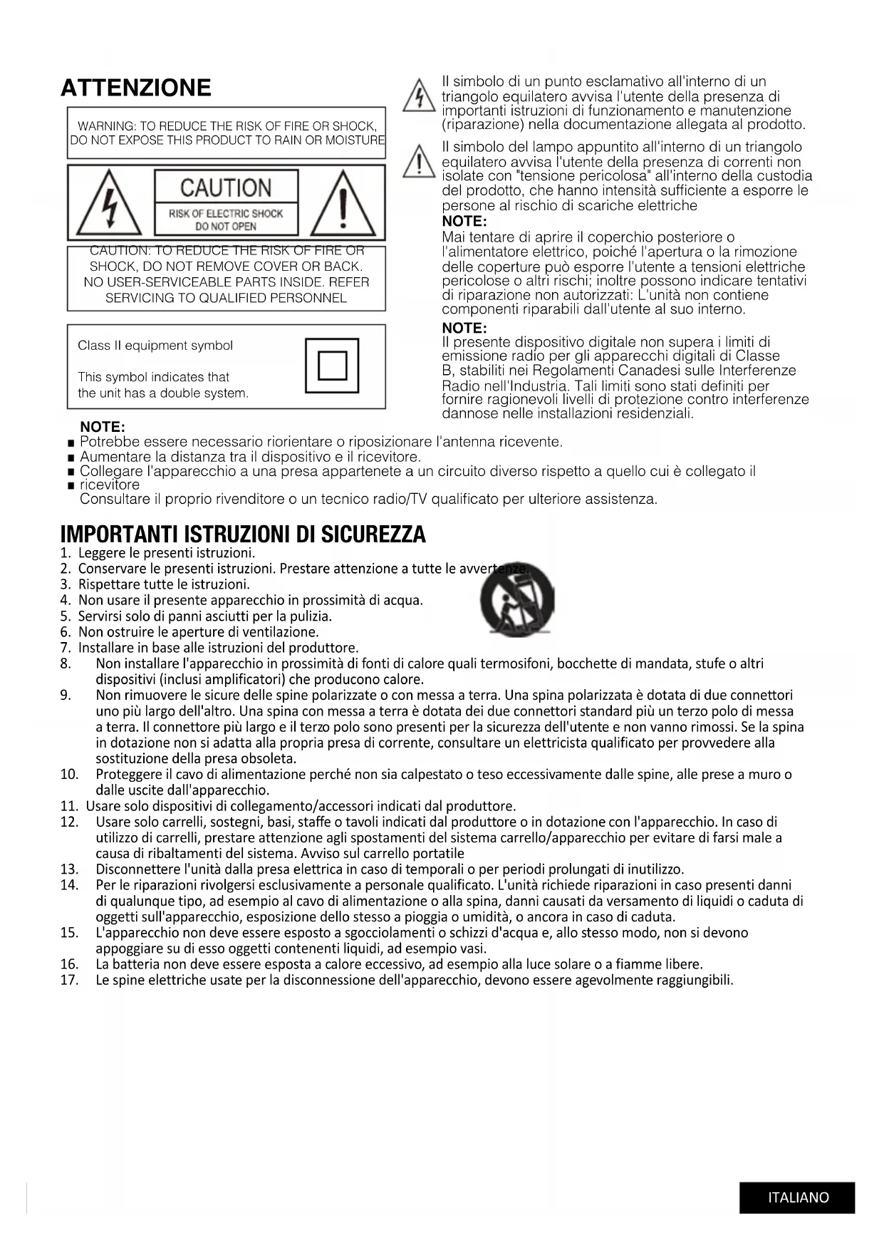 IMPORTANTI ISTRUZIONI DI SICUREZZA