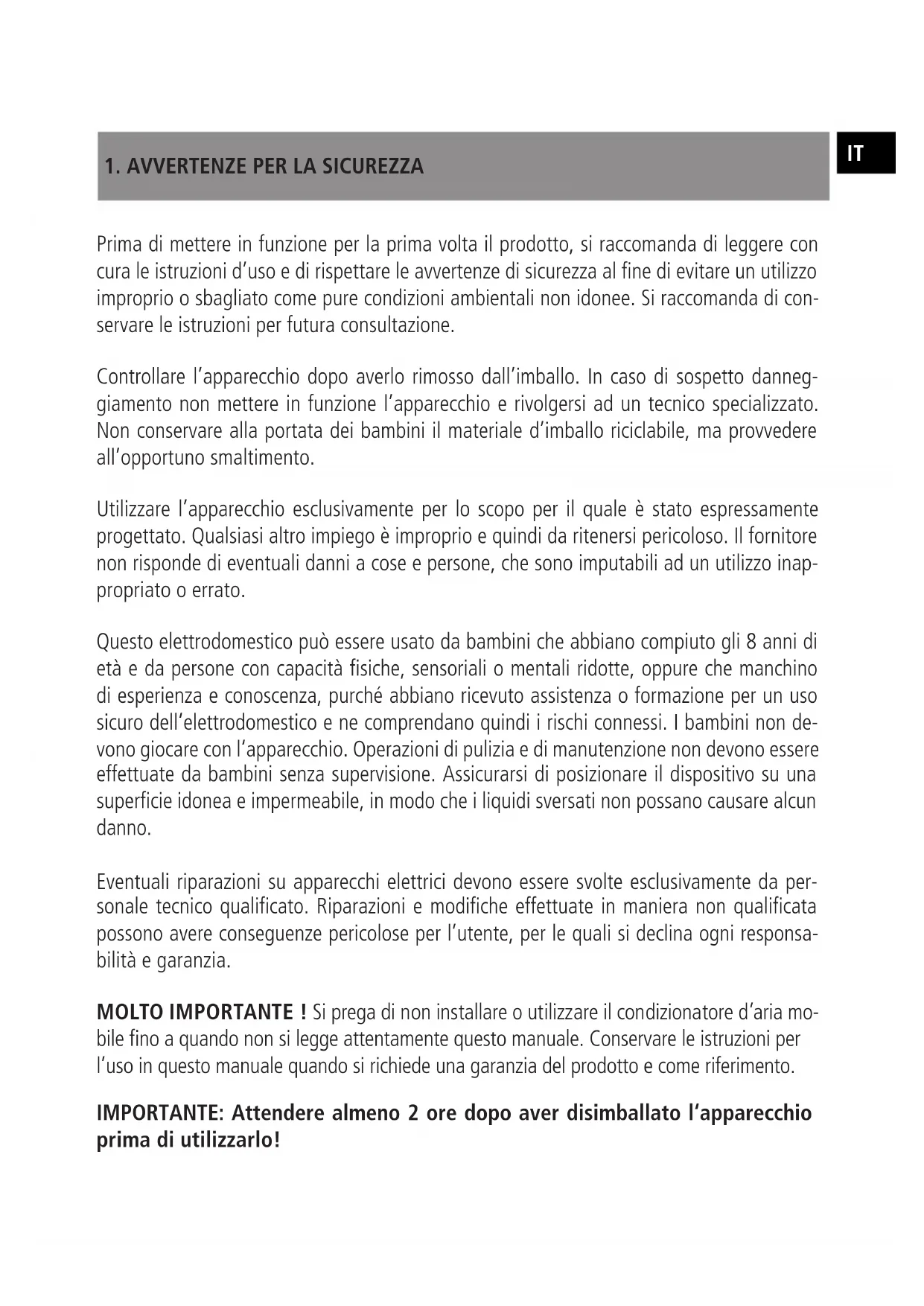 Prima di mettere in funzione per la prima volta il prodotto, si raccomanda di leggere con cura le istruzioni d’uso e di rispettare le avvertenze di sicurezza al fine di evitare un utilizzo improprio o sbagliato come pure condizioni ambientali non idonee. Si raccomanda di con- servare le istruzioni per futura consultazione. Controllare l’apparecchio dopo averlo rimosso dall’imballo. In caso di sospetto danneg- giamento non mettere in funzione l’apparecchio e rivolgersi ad un tecnico specializzato. Non conservare alla portata dei bambini il materiale d’imballo riciclabile, ma provvedere all’opportuno smaltimento. Utilizzare l’apparecchio esclusivamente per lo scopo per il quale è stato espressamente progettato. Qualsiasi altro impiego è improprio e quindi da ritenersi pericoloso. Il fornitore non risponde di eventuali danni a cose e persone, che sono imputabili ad un utilizzo inap- propriato o errato. Questo elettrodomestico può essere usato da bambini che abbiano compiuto gli 8 anni di età e da persone con capacità fisiche, sensoriali o mentali ridotte, oppure che manchino di esperienza e conoscenza, purché abbiano ricevuto assistenza o formazione per un uso sicuro dell‘elettrodomestico e ne comprendano quindi i rischi connessi. I bambini non de- vono giocare con l‘apparecchio. Operazioni di pulizia e di manutenzione non devono essere effettuate da bambini senza supervisione. Assicurarsi di posizionare il dispositivo su una superficie idonea e impermeabile, in modo che i liquidi sversati non possano causare alcun danno. Eventuali riparazioni su apparecchi elettrici devono essere svolte esclusivamente da per- sonale tecnico qualificato. Riparazioni e modifiche effettuate in maniera non qualificata possono avere conseguenze pericolose per l’utente, per le quali si declina ogni responsa- bilità e garanzia. MOLTO IMPORTANTE ! Si prega di non installare o utilizzare il condizionatore d’aria mo- bile fino a quando non si legge attentamente questo manuale. Conservare le istruzioni per l’uso in questo manuale quando si richiede una garanzia del prodotto e come riferimento. IMPORTANTE: Attendere almeno 2 ore dopo aver disimballato l‘apparecchio prima di utilizzarlo!