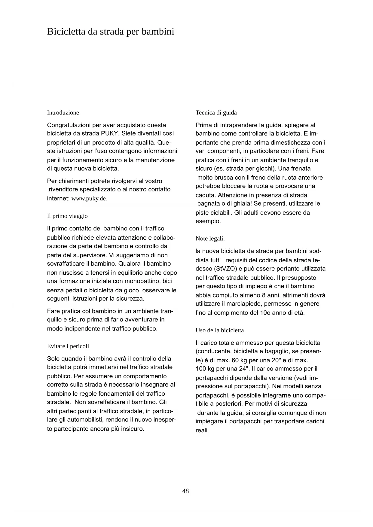 Congratulazioni per aver acquistato questa bicicletta da strada PUKY. Siete diventati così proprietari di un prodotto di alta qualità. Queste istruzioni per l'uso contengono informazioni per il funzionamento sicuro e la manutenzione di questa nuova bicicletta.