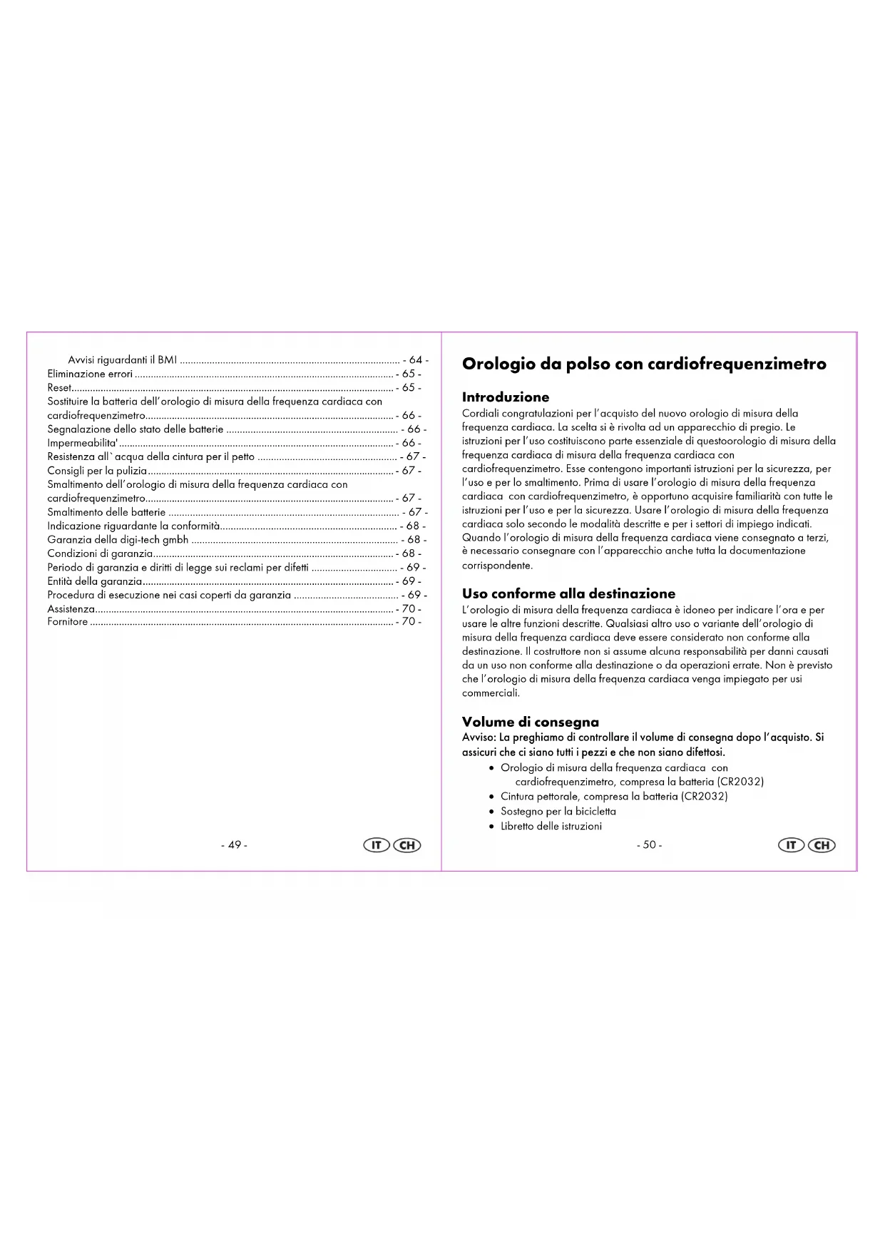 mediante l'istituzione di smaltimento del Suo comune. Si attenga alle prescrizioni attualmente in vigore. In caso di dubbi si metta in contatto con la Sua istituzione di smaltimento. Indicazione riguardante la conformità Se utilizzato per le finalità d'uso previste, questo prodotto è conforme ai requisiti essenziali del § 3 e alle altre disposizioni pertinenti la FTEG (articolo 3 della norma R&TTE). È possibile richiedere la dichiarazione di conformità a: conformity@digi-tech-gmbh.com Garanzia della digi-tech gmbh Questo orologio prevede una garanzia di 3 anni dall‘acquisto. In caso di difetti di questo orologio vi spettano i diritti legali nei confronti del venditore del prodotto. Questi diritti di legge non vengono ridotti dalla nostra garanzia descritta al punto seguente. Condizioni di garanzia Il periodo di garanzia decorre dalla data di acquisto. Conservare con cura lo scontrino originale di cassa. Questa documentazione è necessaria per comprovare l’acquisto. Se nei tre anni dall’acquisto di questoorologio di misura della frequenza cardiaca subentra un difetto di materiale o di fabbricazione, l’orologio verrà riparato gratuitamente o sostituito a nostra discrezione. Questa prestazione di garanzia prevede che all’interno del termine di tre anni presentiate l’orologio difettoso e la ricevuta di acquisto (scontrino) e che descriviate brevemente la tipologia del difetto e quando è stato rilevato. Se il guasto è coperto dalla nostra garanzia, riceverete l’orologio riparato o uno nuovo. Con la riparazione o sostituzione del prodotto non comincia un nuovo periodo di garanzia.-