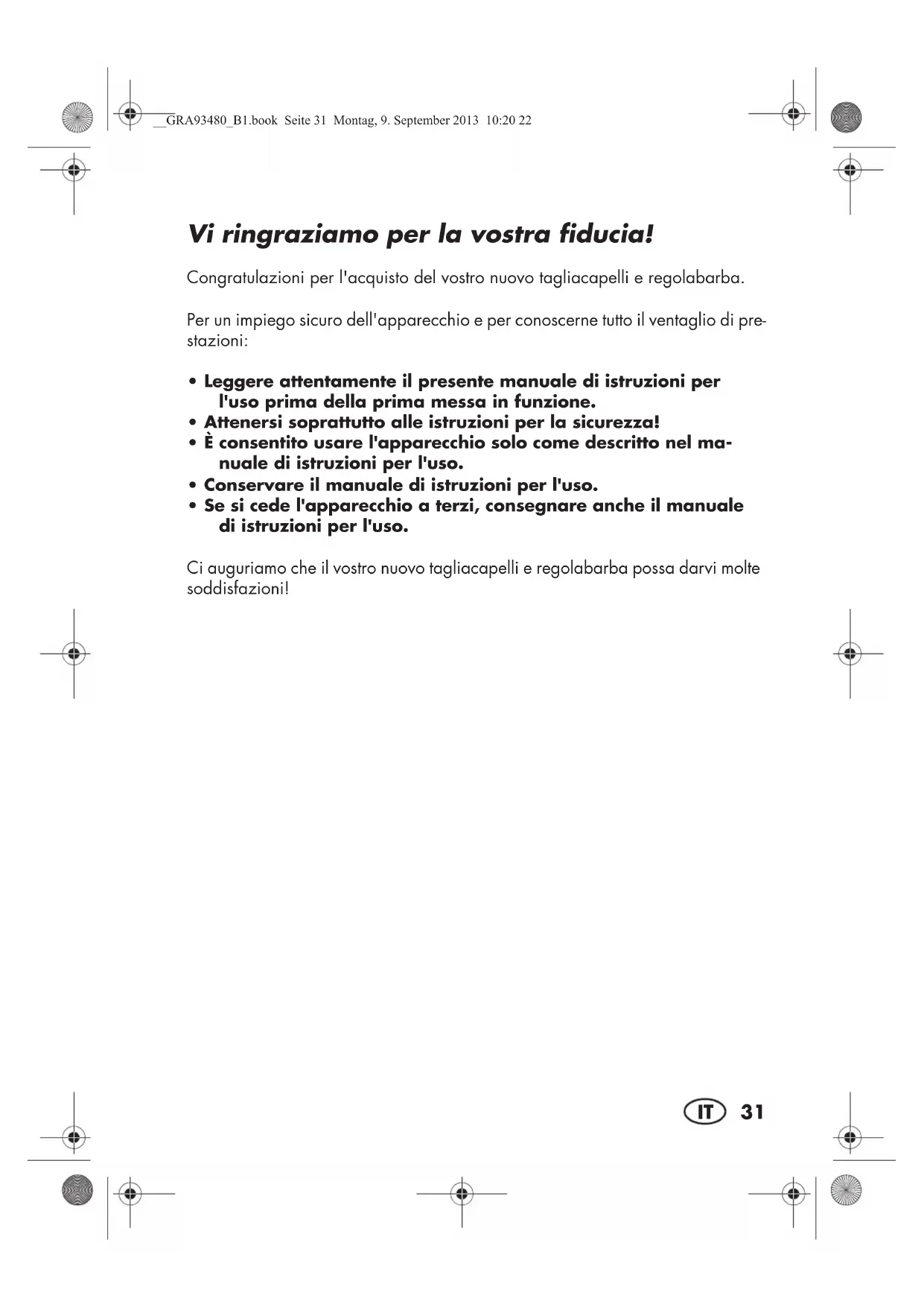 - Se si cede l'apparecchio a terzi, consegnare anche il manuale di istruzioni per l'uso. Ci auguriamo che il vostro nuovo tagliacapelli e regolabarba possa darvi molte soddisfazioni! __GRA93480_B1.book Seite 31 Montag, 9. September 2013 10:20 2232