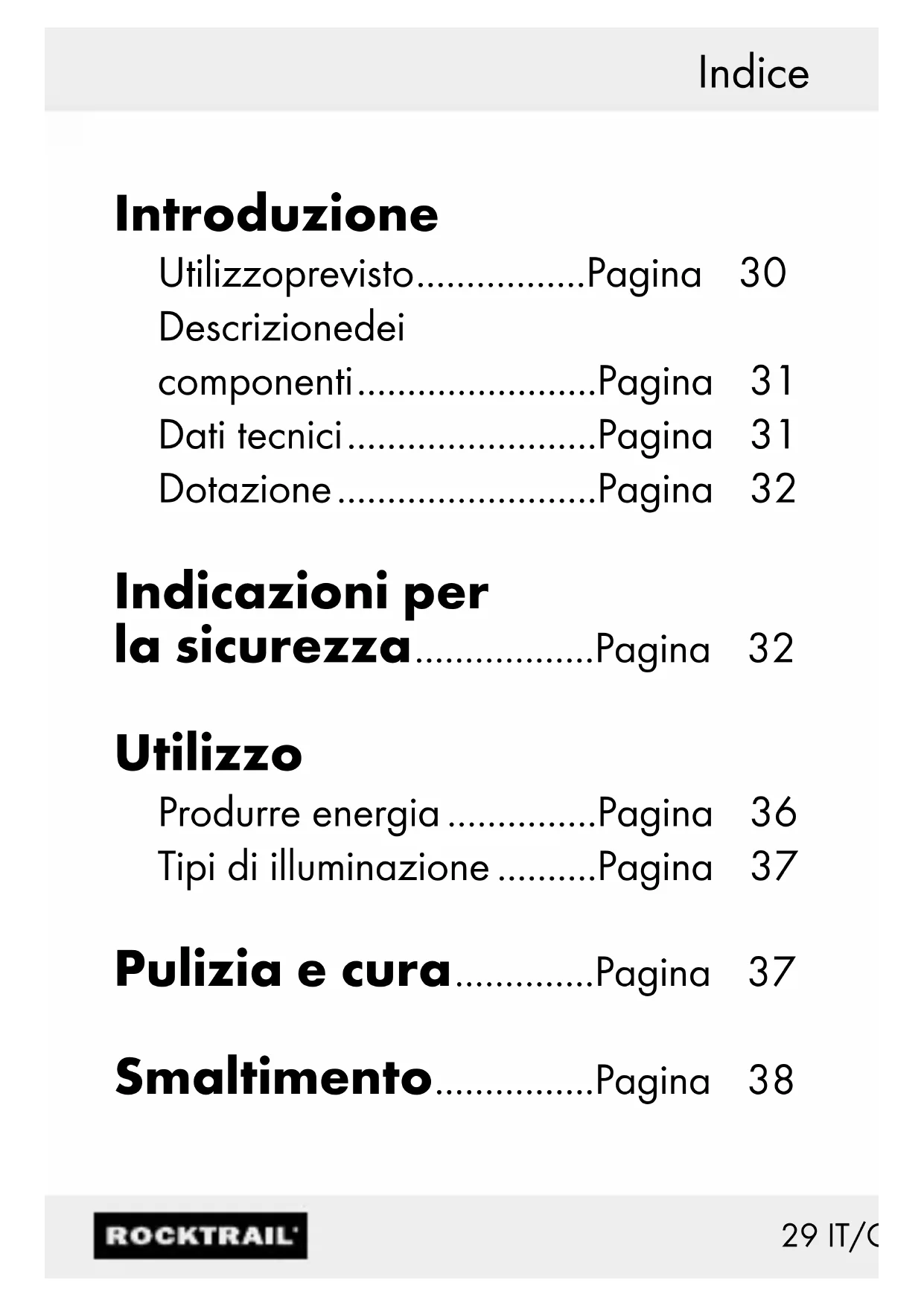 Indice Introduzione Utilizzo previsto .................Pagina 30 Descrizione dei componenti ........................Pagina 31 Dati tecnici .........................Pagina 31 Dotazione ..........................Pagina 32 Indicazioni per la sicurezza ..................Pagina 32 Utilizzo Produrre energia ...............Pagina 36 Tipi di illuminazione ..........Pagina 37 Pulizia e cura ..............Pagina 37 Smaltimento ................Pagina 3830 IT/CH Introduzione Luce LED con manovella