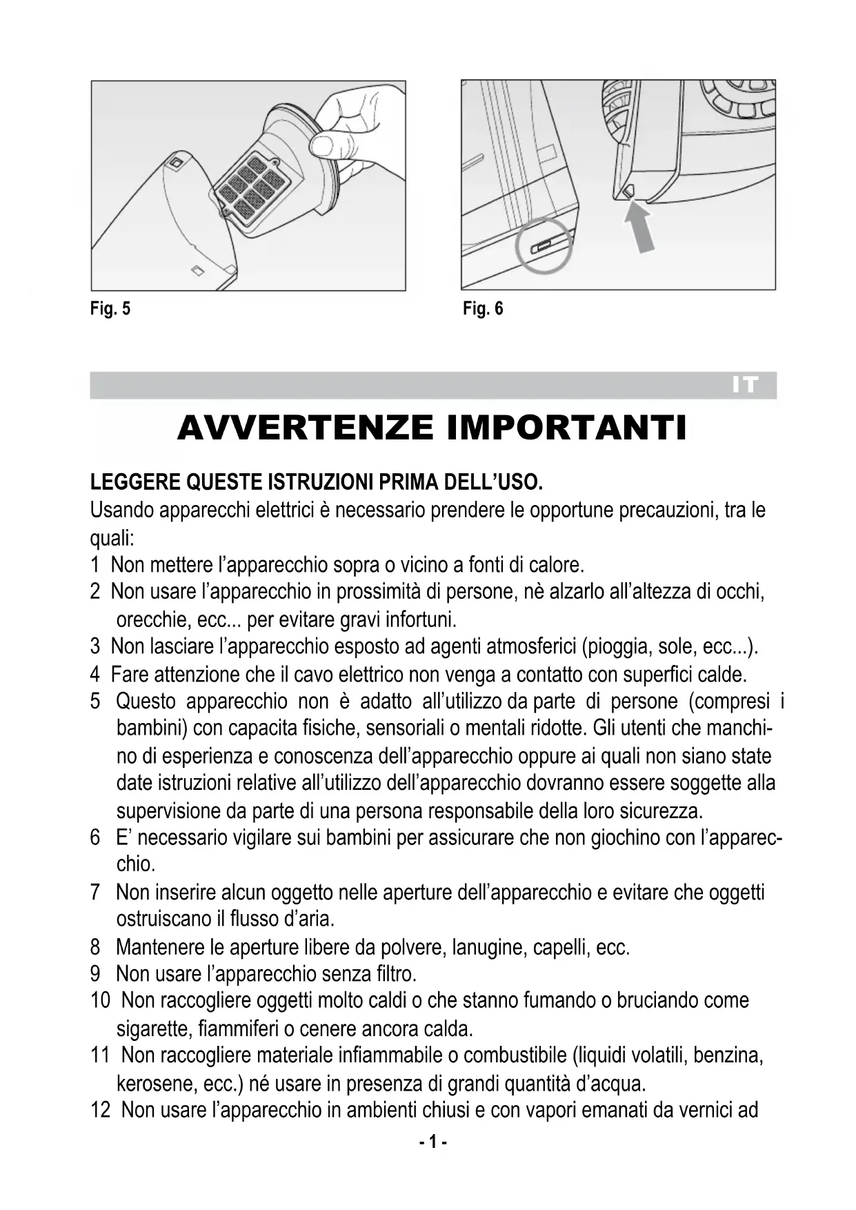 AVVERTENZE IMPORTANTI LEGGERE QUESTE ISTRUZIONI PRIMA DELL’USO. Usando apparecchi elettrici è necessario prendere le opportune precauzioni, tra le quali: 1 Non mettere l’apparecchio sopra o vicino a fonti di calore. 2 Non usare l’apparecchio in prossimità di persone, nè alzarlo all’altezza di occhi, orecchie, ecc... per evitare gravi infortuni. 3 Non lasciare l’apparecchio esposto ad agenti atmosferici (pioggia, sole, ecc...). 4 Fare attenzione che il cavo elettrico non venga a contatto con superfici calde. 5 Questo apparecchio non è adatto all’utilizzo da parte di persone (compresi i bambini) con capacita fisiche, sensoriali o mentali ridotte. Gli utenti che manchi- no di esperienza e conoscenza dell’apparecchio oppure ai quali non siano state date istruzioni relative all’utilizzo dell’apparecchio dovranno essere soggette alla supervisione da parte di una persona responsabile della loro sicurezza. 6 E’ necessario vigilare sui bambini per assicurare che non giochino con l’apparec- chio. 7 Non inserire alcun oggetto nelle aperture dell’apparecchio e evitare che oggetti ostruiscano il flusso d’aria. 8 Mantenere le aperture libere da polvere, lanugine, capelli, ecc. 9 Non usare l’apparecchio senza filtro. 10 Non raccogliere oggetti molto caldi o che stanno fumando o bruciando come sigarette, fiammiferi o cenere ancora calda. 11 Non raccogliere materiale infiammabile o combustibile (liquidi volatili, benzina, kerosene, ecc.) né usare in presenza di grandi quantità d’acqua. 12 Non usare l’apparecchio in ambienti chiusi e con vapori emanati da vernici ad Fig. 5 Fig. 6IT