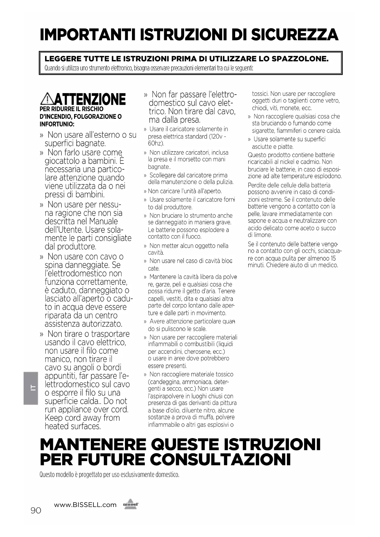 - Grazie di aver acqutato uno spazzole BISSELL Siamo lieti che abbia acquistato un nostro elettrodomestico. In questo elettrodomestico completo e di ulti- ma generazione abbiamo racchiuso tutte le nostre conoscenze su come mantenere puliti i pavimenti domes- tici e abbiamo anche aggiunto un tocco di design moderno. Il pulitore per macchie portatile BISSELL è solido ed è venduto assieme a una garanzia limitata di due anni. In qualsiasi momento è comunque possibile prendere con- tatto con il nostro dipartimento di Consumer Care per ottenere un’assistenza veloce e attenta nel caso in cui abbia un problema. Fu mio nonno nel 1876 a inventare lo spazzolone per pavimenti e oggi BISSELL può vantarsi di essere un leader a livello mondiale nel design, nella produzione e nei servizi di alta qualità nel settore dei prodotti per la pulizia domestica come d’altronde le è chiaro avendo acquistato il nostro spazzolone BISSELL. Tutta la BISSELL la ringrazia nuova- mente per il suo acquisto. Mark J. Bissell Presidente & CEO Istruzioni di sicurezza p. 90