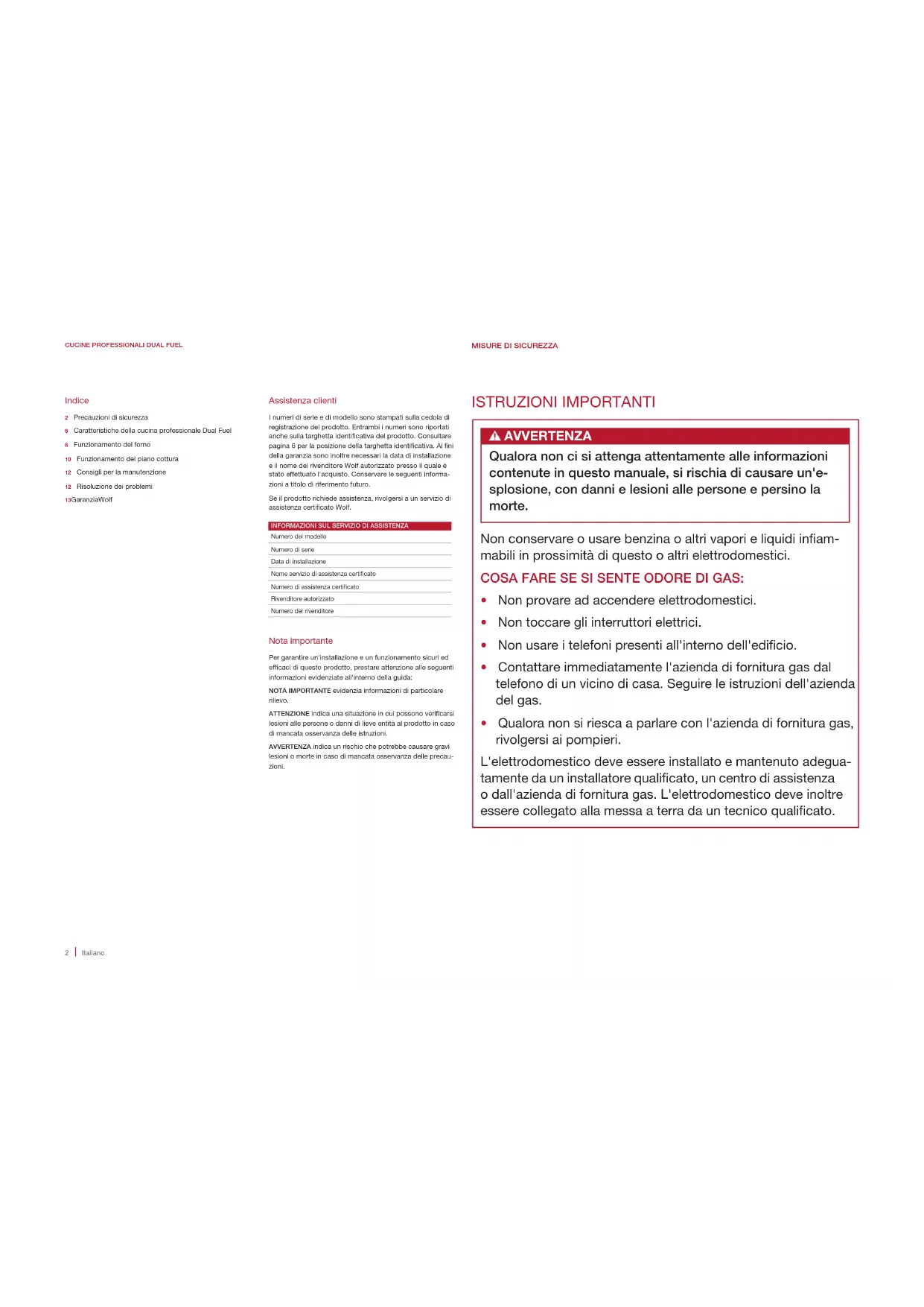 Assistenza clienti I numeri di serie e di modello sono stampati sulla cedola di registrazione del prodotto. Entrambi i numeri sono riportati anche sulla targhetta identicativa del prodotto. Consultare pagina 6 per la posizione della targhetta identicativa. Ai ni della garanzia sono inoltre necessari la data di installazione e il nome del rivenditore Wolf autorizzato presso il quale è stato effettuato l'acquisto. Conservare le seguenti informa-zioni a titolo di riferimento futuro. Se il prodotto richiede assistenza, rivolgersi a un servizio di assistenza certicato Wolf.INFORMAZIONI SUL SERVIZIO DI ASSISTENZANumero del modelloNumero di serieData di installazioneNome servizio di assistenza certicatoNumero di assistenza certicatoRivenditore autorizzatoNumero del rivenditore Nota importante Per garantire un'installazione e un funzionamento sicuri ed efcaci di questo prodotto, prestare attenzione alle seguenti informazioni evidenziate all'interno della guida:NOTA IMPORTANTE evidenzia informazioni di particolare rilievo. ATTENZIONE indica una situazione in cui possono vericarsi lesioni alle persone o danni di lieve entità al prodotto in caso di mancata osservanza delle istruzioni.AVVERTENZA indica un rischio che potrebbe causare gravi lesioni o morte in caso di mancata osservanza delle precau-zioni. ISTRUZIONI IMPORTANTI AVVERTENZA Qualora non ci si attenga attentamente alle informazioni contenute in questo manuale, si rischia di causare un'e- splosione, con danni e lesioni alle persone e persino la morte. Non conservare o usare benzina o altri vapori e liquidi inam- mabili in prossimità di questo o altri elettrodomestici. COSA FARE SE SI SENTE ODORE DI GAS: