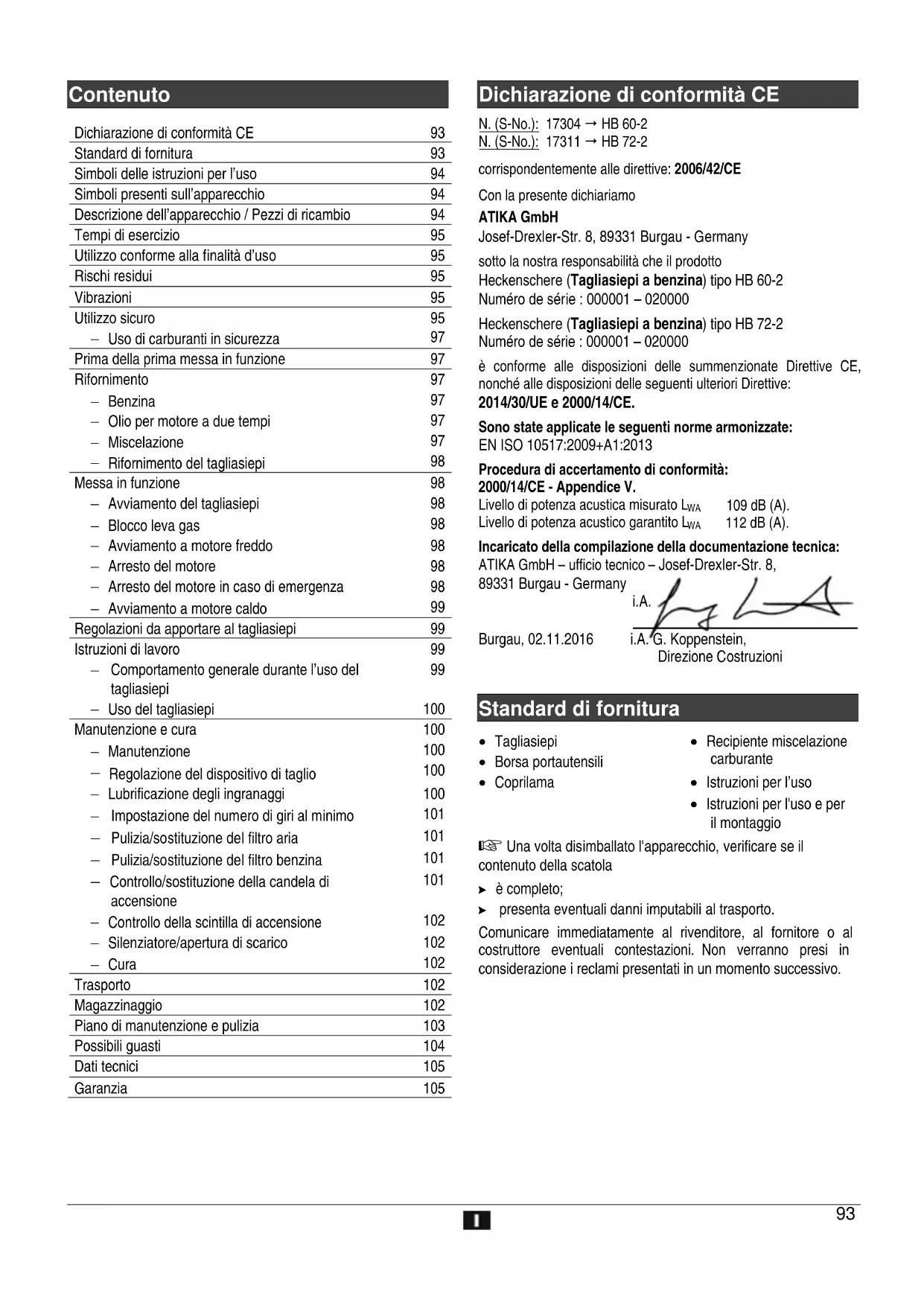 Con la presente dichiariamo ATIKA GmbH Josef-Drexler-Str. 8, 89331 Burgau - Germany sotto la nostra responsabilità che il prodotto Heckenschere (Tagliasiepi a benzina) tipo HB 60-2 Numéro de série : 000001 – 020000 Heckenschere (Tagliasiepi a benzina) tipo HB 72-2 Numéro de série : 000001 – 020000 è conforme alle disposizioni delle summenzionate Direttive CE, nonché alle disposizioni delle seguenti ulteriori Direttive: 2014/30/UE e 2000/14/CE. Sono state applicate le seguenti norme armonizzate: