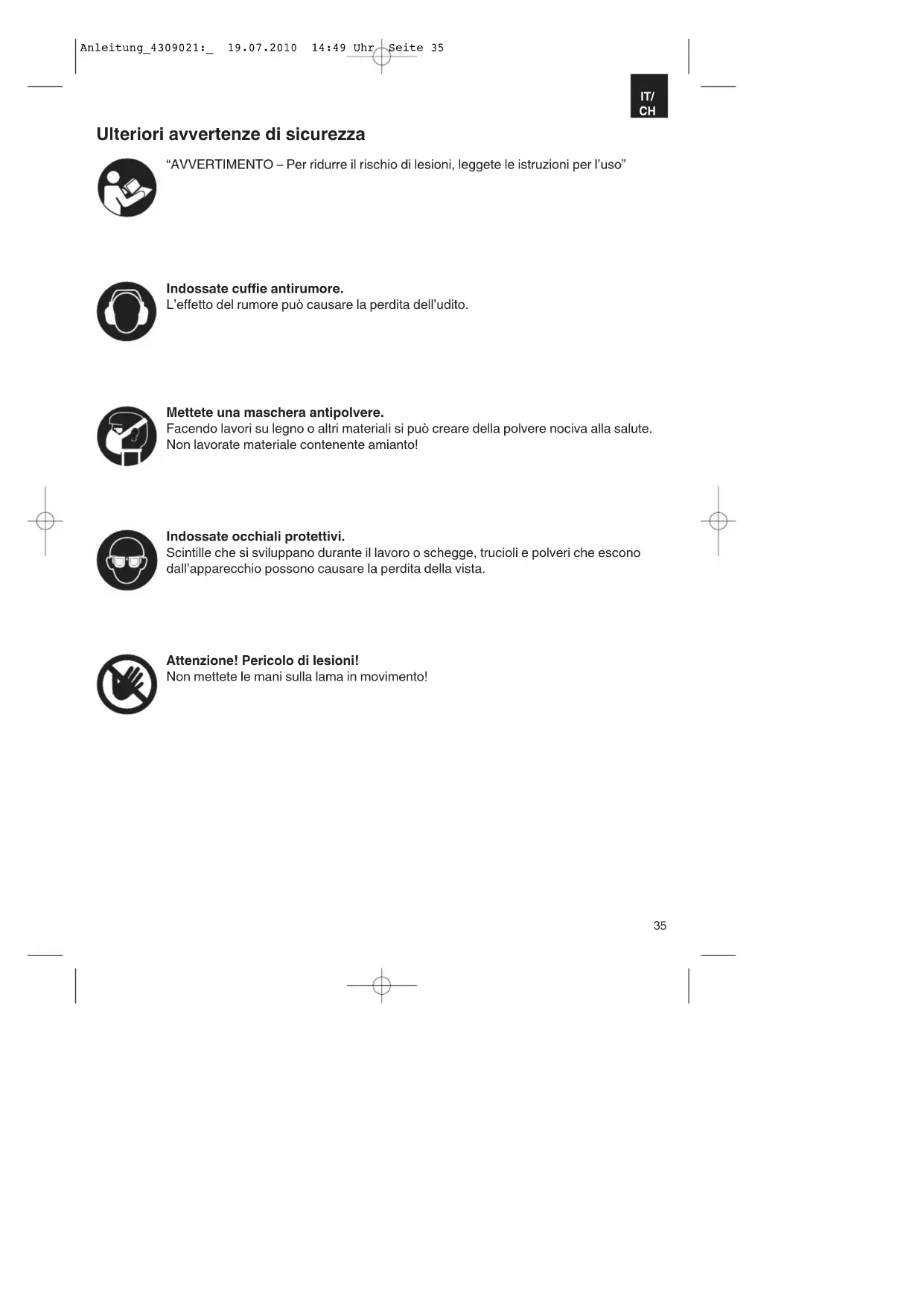 “AVVERTIMENTO – Per ridurre il rischio di lesioni, leggete le istruzioni per l’uso” Indossate cuffie antirumore. L’effetto del rumore può causare la perdita dell’udito. Mettete una maschera antipolvere. Facendo lavori su legno o altri materiali si può creare della polvere nociva alla salute. Non lavorate materiale contenente amianto! Indossate occhiali protettivi. Scintille che si sviluppano durante il lavoro o schegge, trucioli e polveri che escono dall’apparecchio possono causare la perdita della vista. Attenzione! Pericolo di lesioni! Non mettete le mani sulla lama in movimento! Ulteriori avvertenze di sicurezza Anleitung_4309021:_ 19.07.2010 14:49 Uhr Seite 351. Introduzione Attenzione! Nell’usare gli apparecchi si devono prendere diverse misure di sicurezza per evitare lesioni e danni. Quindi leggete attentamente queste istruzioni per l’uso/avvertenze di sicurezza. Conservate bene le informazioni per averle a disposizione in qualsiasi momento. Se date l’apparecchio ad altre persone, consegnate anche queste istruzioni per l’uso/avvertenze di sicurezza insieme all’apparecchio. Non ci assumiamo alcuna responsabilità per incidenti o danni causati dal mancato rispetto di queste istruzioni e delle avvertenze di sicurezza.