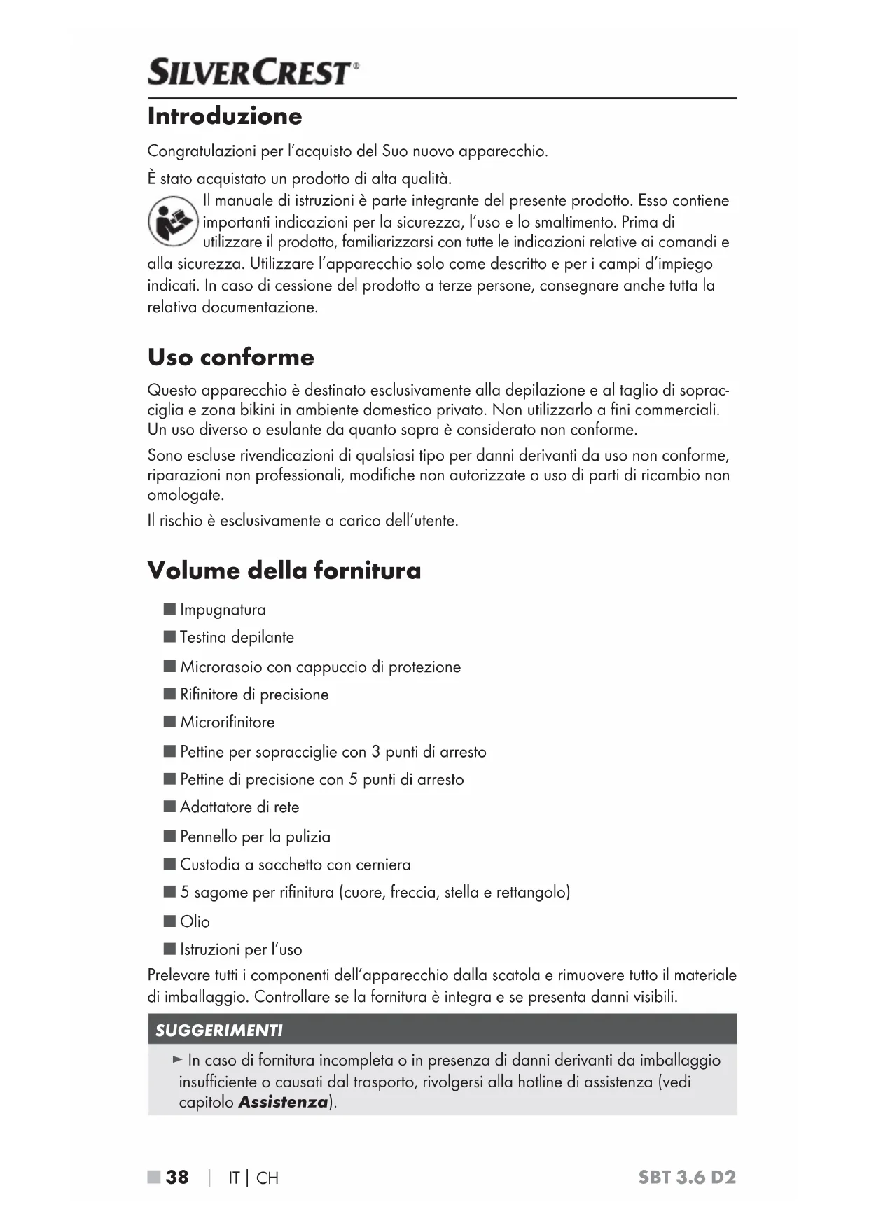 Scarica le istruzioni per il tuo Rasoio donna in formato PDF gratuitamente! Trova il tuo manuale SBT 3.6 D2 - SILVERCREST e riprendi in mano il tuo dispositivo elettronico. In questa pagina sono pubblicati tutti i documenti necessari per l'utilizzo del tuo dispositivo. SBT 3.6 D2 del marchio SILVERCREST.