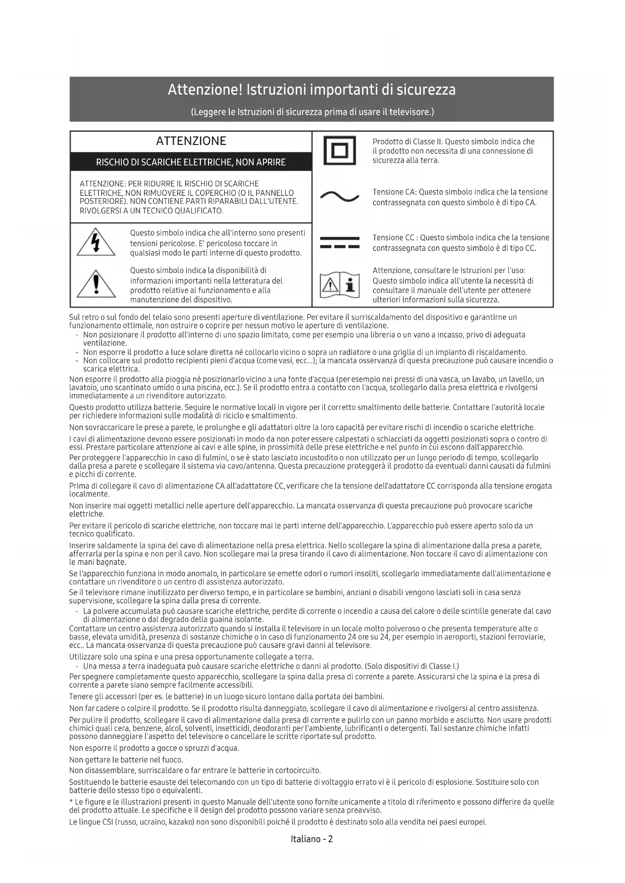 DISTANCE DES BOUGIES OU AUTRES FLAMMES OUVERTES. Français - 15 Français KS8000_ZG_BN68-07862L-01_L04.indb 15 2016-05-24 2:11:30Attenzione! Istruzioni importanti di sicurezza (Leggere le Istruzioni di sicurezza prima di usare il televisore.) ATTENZIONE Prodotto di Classe II: Questo simbolo indica che il prodotto non necessita di una connessione di sicurezza alla terra.