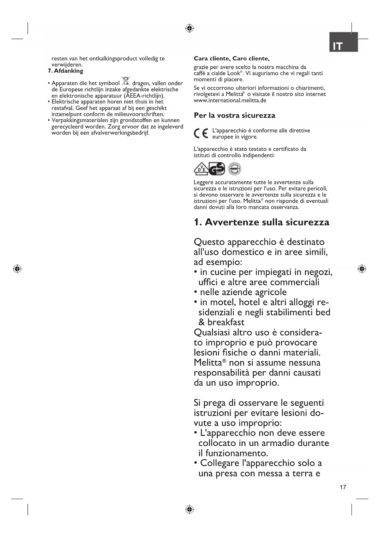 L'apparecchio è conforme alle direttive europee in vigore. L'apparecchio è stato testato e certificato da istituti di controllo indipendenti: Leggere accuratamente tutte le avvertenze sulla sicurezza e le istruzioni per l'uso. Per evitare pericoli, si devono osservare le avvertenze sulla sicurezza e le istruzioni per l'uso. Melitta