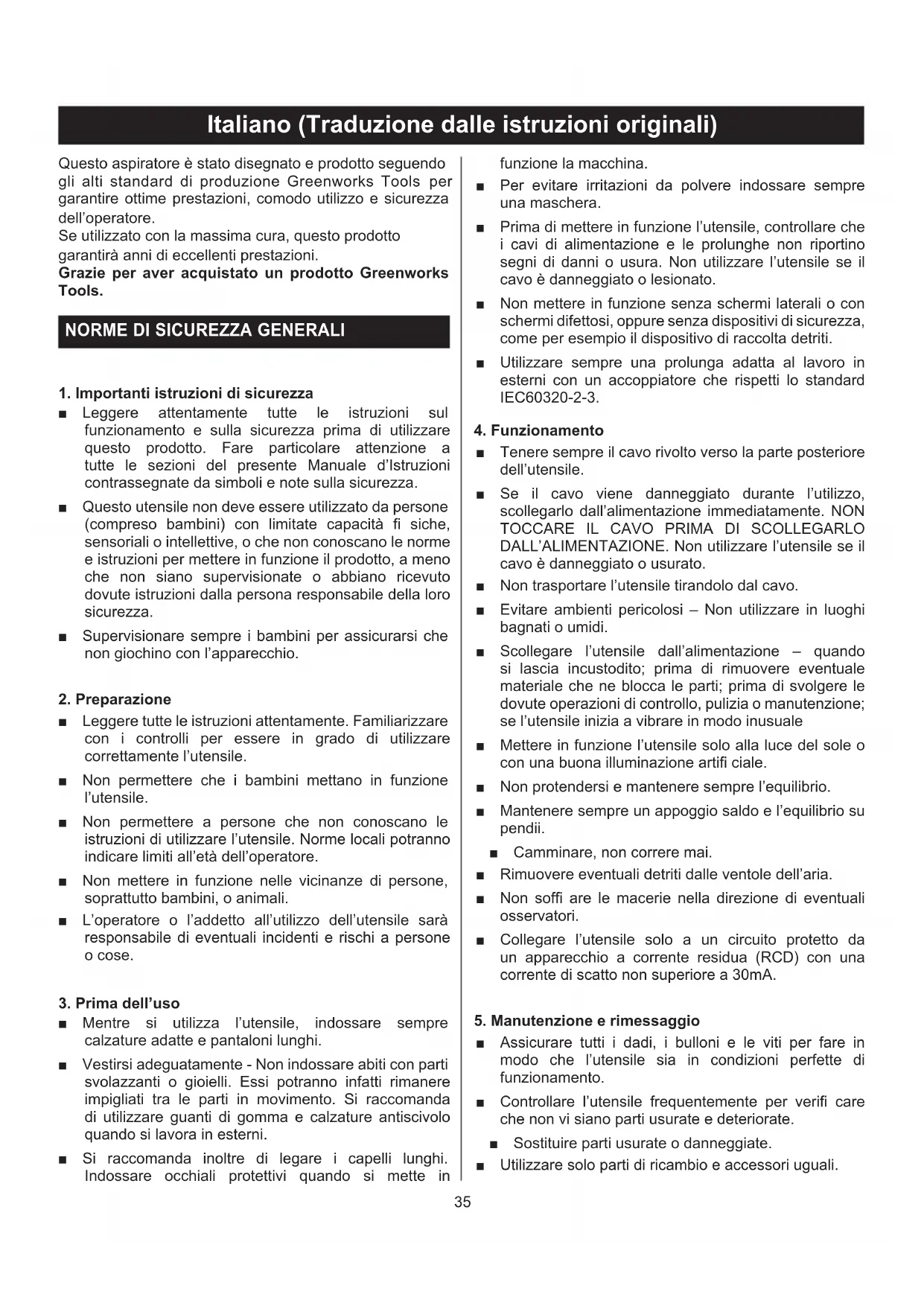Italiano (Traduzione dalle istruzioni originali) MONTAGGIO RIMOZIONE IMBALLO ■ Rimuovere attentamente il prodotto e i suoi accessori dalla scatola. ■ Ispezionare il prodotto attentamente per assicurarsi che non si siano verificate rotture o danni durante il trasporto. ■ Non smaltire il materiale dell'imballo fino a che il prodotto non sia stato attentamente controllato e messo correttamente in funzione. ■ In caso di parti danneggiate o mancanti, chiamare il centro servizi Greenworks Tools per assistenza. Il sofatore e aspiratore è fornito con alcuni accessori non montati. Per montare questi ultimi, procedere come segue: MONTAGGIO ACCESSORIO DI TRITURAZIONE (Fig.2) ■ Far scorrere i tubi anteriori e posteriori del trituratore assieme fino a che non siano bloccati. (Vedere la fig 2) ■ Spingere il tasto di blocco in avanti per sbloccare l'apertura. Tenere aperta l'apertura. (Vedere la fig 2.1) ■ Inserire il fermaglio con l'estremità “a cuneo” del tubo di triturazione nel fermaglio posteriore. (Vedere la fig 2.2). Spingere il fermaglio con l'estremità “a gancio” del tubo di triturazione nel fermaglio anteriore. (Vedere la fig 2.3). Premere il tasto di blocco per bloccare il tubo di triturazione. (Vedere la fig 2.4) ■ Per rimuovere i tubi di triturazione, seguire le fasi (3) (2) (1). ■ Inserire l'adattatore del sacchetto nell'uscita del soffiatore. Bloccare l'adattatore del sacchetto con il tasto di blocco. Per rimuovere il sacchetto, premere il tasto di blocco e staccare il sacchetto. (Vedere la fig 4). NOTA: Potrà essere necessario rimuovere il tubo del sofatore o i tubi di triturazione per pulire un tubo bloccato o una ventola. AVVERTENZE: Per prevenire eventuali lesioni alla persona, assicurarsi che l'interruttore sia sulla posizione OFF (Spento), che sia scollegato e che le ventole si siano fermate prima di collegare o rimuovere i tubi MONTAGGIO ACCESSORIO SOFFIATORE (Fig.3) ■ Far scorrere il tubo del soffiatore in avanti fino a che le aree contrassegnate da tacche di direzione sul soffiatore non scattino all'interno delle fessure sul tubo. MONTARE IL SACCHETTO CON LA CINGHIA DA SPALLA (Fig. 4) ■ Nella posizione di funzionamento regolare la lunghezza a misura dell'operatore. Tirare la linguetta per allungare, tirare la cinghia a per accorciare. FUNZIONAMENTO COLLEGARE IL CAVO DELL'ALIMENTAZIONE (Fig. 5) ■ Assicurare il cavo della prolunga alla sede del motore utilizzando la tacca nella parte posteriore del soffiatore. In questo modo si eviterà il distacco accidentale del cavo elettrico. ■ Collegare l'estremità femmina del cavo elettrico alla presa nella parte posteriore dell'unità.. AVVIO/ARRESTO DEL SOFFIATORE/TRITURATORE (Fig. 6) ■ Per accendere: Spostare l'interruttore su ON. ■ Ruotare la manopola in vanti per aumentare la velocità. ■ Per spegnere: Spostare l'interruttore sulla posizione OFF. IMPORTANTE: Nella modalità triturazione il sofatore DEVE essere impostato sulla posizione alta velocità.