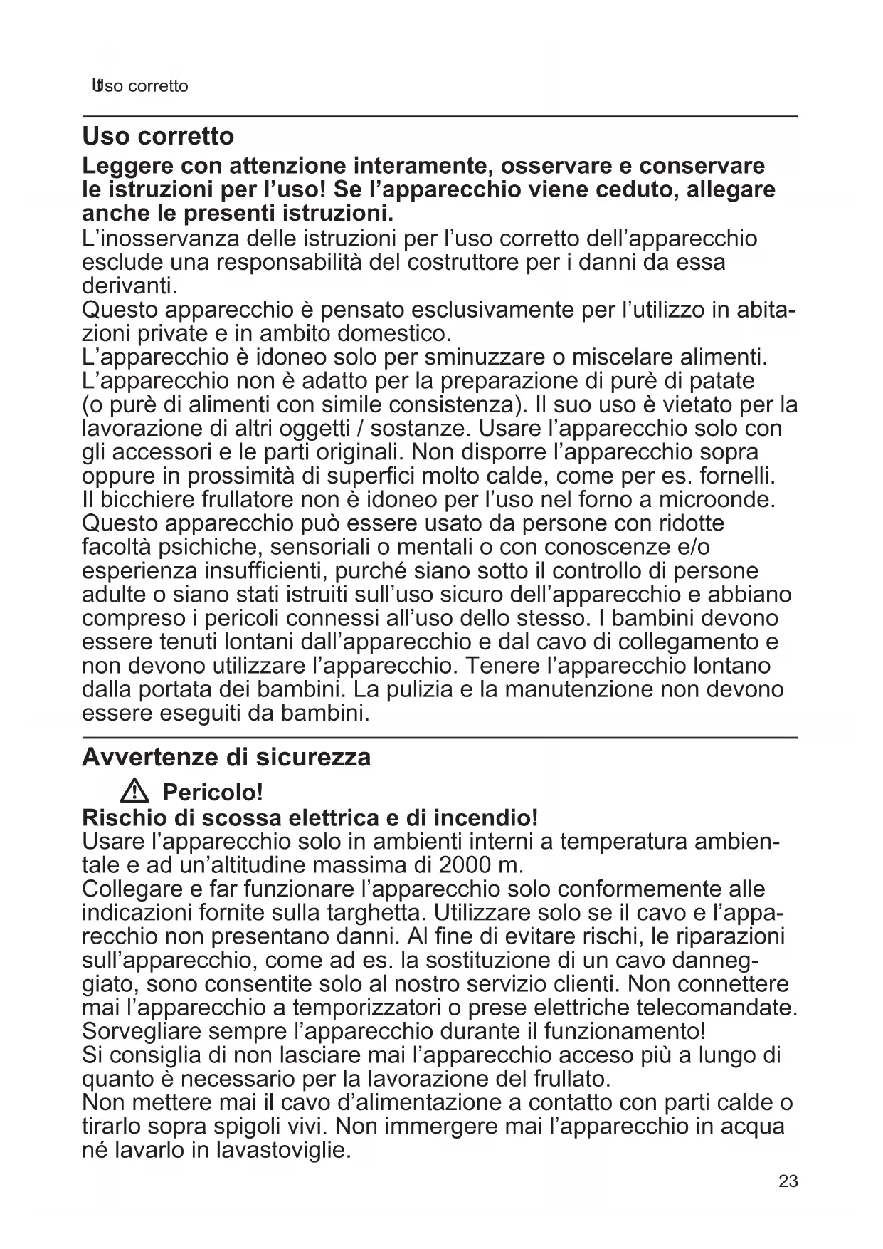 Uso corretto Uso corretto Leggere con attenzione interamente, osservare e conservare le istruzioni per l’uso! Se l’apparecchio viene ceduto, allegare anche le presenti istruzioni. L’inosservanza delle istruzioni per l’uso corretto dell’apparecchio esclude una responsabilità del costruttore per i danni da essa derivanti. Questo apparecchio è pensato esclusivamente per l’utilizzo in abita- zioni private e in ambito domestico. L’apparecchio è idoneo solo per sminuzzare o miscelare alimenti. L’apparecchio non è adatto per la preparazione di purè di patate (o purè di alimenti con simile consistenza). Il suo uso è vietato per la lavorazione di altri oggetti / sostanze. Usare l’apparecchio solo con gli accessori e le parti originali. Non disporre l’apparecchio sopra oppure in prossimità di superfici molto calde, come per es. fornelli. Il bicchiere frullatore non è idoneo per l’uso nel forno a microonde. Questo apparecchio può essere usato da persone con ridotte facoltà psichiche, sensoriali o mentali o con conoscenze e/o esperienza insufficienti, purché siano sotto il controllo di persone adulte o siano stati istruiti sull’uso sicuro dell’apparecchio e abbiano compreso i pericoli connessi all’uso dello stesso. I bambini devono essere tenuti lontani dall’apparecchio e dal cavo di collegamento e non devono utilizzare l’apparecchio. Tenere l’apparecchio lontano dalla portata dei bambini. La pulizia e la manutenzione non devono essere eseguiti da bambini. Avvertenze di sicurezza W Pericolo! Rischio di scossa elettrica e di incendio! Usare l’apparecchio solo in ambienti interni a temperatura ambien- tale e ad un’altitudine massima di 2000 m. Collegare e far funzionare l’apparecchio solo conformemente alle indicazioni fornite sulla targhetta. Utilizzare solo se il cavo e l’appa- recchio non presentano danni. Al fine di evitare rischi, le riparazioni sull’apparecchio, come ad es. la sostituzione di un cavo danneg- giato, sono consentite solo al nostro servizio clienti. Non connettere mai l’apparecchio a temporizzatori o prese elettriche telecomandate. Sorvegliare sempre l’apparecchio durante il funzionamento! Si consiglia di non lasciare mai l’apparecchio acceso più a lungo di quanto è necessario per la lavorazione del frullato. Non mettere mai il cavo d’alimentazione a contatto con parti calde o tirarlo sopra spigoli vivi. Non immergere mai l’apparecchio in acqua né lavarlo in lavastoviglie.24 it Avvertenze di sicurezza Non usare l’apparecchio con le mani bagnate e non farlo funzionare a vuoto. Non immergere l’apparecchio nell’alimento da frullare oltre il punto di unione fra piede frullatore ed apparecchio base. L’apparecchio va sempre scollegato dalla rete elettrica dopo ogni utilizzo, se lasciato incostudito, prima del montaggio, dello smontag- gio, della pulizia e in caso di guasto. W Pericolo! Pericolo di lesioni! Non appena viene spento l’apparecchio, attendere che le lame del piede frullatore si siano fermate. Prima di cambiare gli accessori o le parti aggiuntive in movimento durante il funzionamento, spegnere l’apparecchio e scollegarlo dalla rete elettrica. Non inserire mai le mani nel bicchiere frullatore. Non pulire mai a mani nude la lama del piede frullatore. W Pericolo! Pericolo di ustioni! Fare attenzione durante la lavorazione di alimenti da frullare bol- lenti. Gli alimenti da frullare bollenti possono schizzare durante la lavorazione. Non deporre mai il piede frullatore su superfici molto calde, né utilizzarlo in alimenti da frullare bollenti. Prima di lavorare alimenti da frullare bollenti, farli raffreddare ad almeno 80°C. Se si usa il frullatore ad immersione in una pentola, togliere prima la pentola dal fuoco. W Pericolo! Pericolo di soffocamento! Non lasciare che i bambini giochino con il materiale di imballaggio. W Importante! Lavare sempre a fondo l’apparecchio dopo ogni utilizzo o dopo un lungo periodo di inattività. X “Pulizia e cura quotidiana” ved. pagina 2725