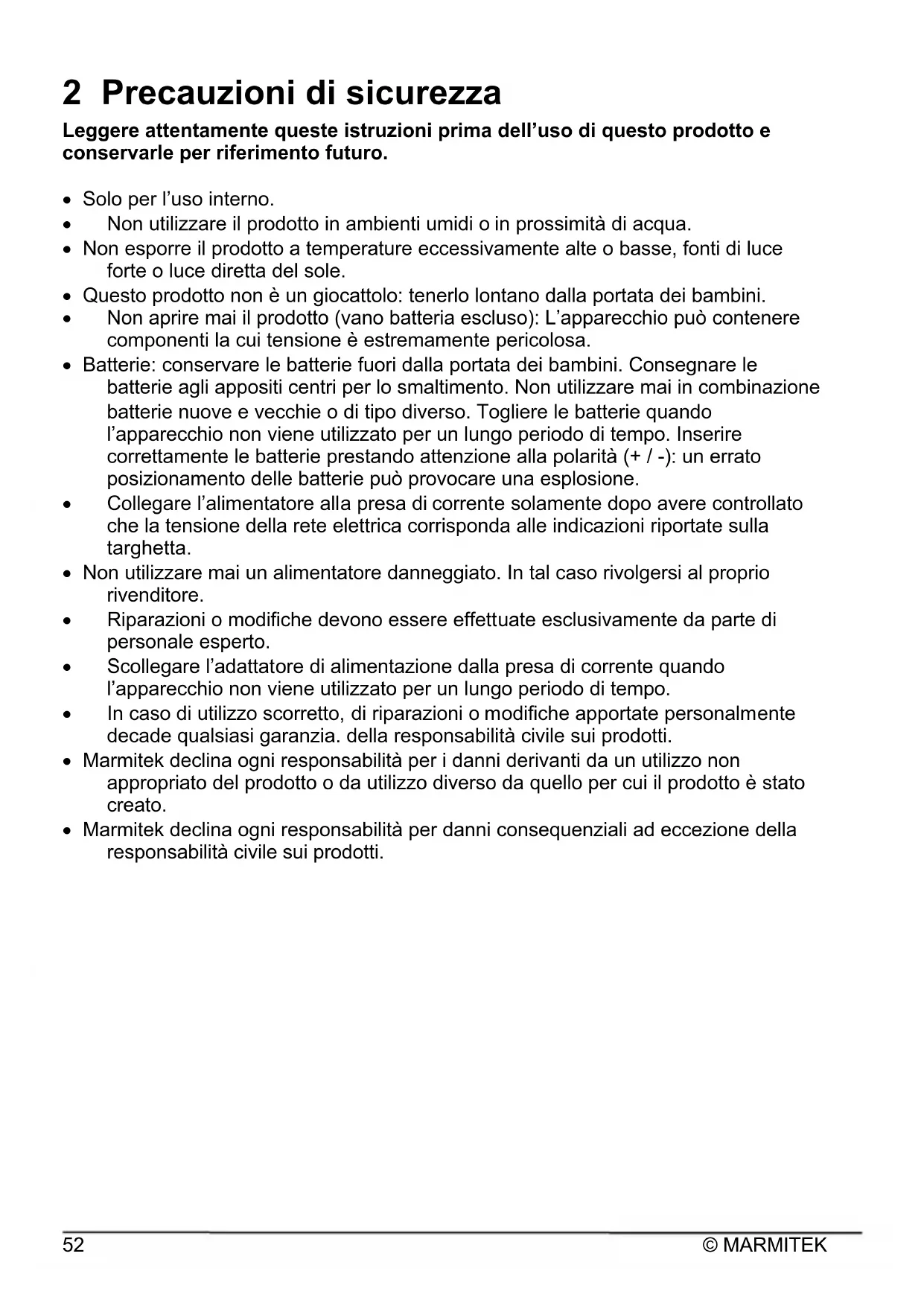 2 Precauzioni di sicurezza Leggere attentamente queste istruzioni prima dell’uso di questo prodotto e conservarle per riferimento futuro. x Solo per l’uso interno. x Non utilizzare il prodotto in ambienti umidi o in prossimità di acqua. x Non esporre il prodotto a temperature eccessivamente alte o basse, fonti di luce forte o luce diretta del sole. x Questo prodotto non è un giocattolo: tenerlo lontano dalla portata dei bambini. x Non aprire mai il prodotto (vano batteria escluso): L’apparecchio può contenere componenti la cui tensione è estremamente pericolosa. x Batterie: conservare le batterie fuori dalla portata dei bambini. Consegnare le batterie agli appositi centri per lo smaltimento. Non utilizzare mai in combinazione batterie nuove e vecchie o di tipo diverso. Togliere le batterie quando l’apparecchio non viene utilizzato per un lungo periodo di tempo. Inserire correttamente le batterie prestando attenzione alla polarità (+ / -): un errato posizionamento delle batterie può provocare una esplosione. x Collegare l’alimentatore alla presa di corrente solamente dopo avere controllato che la tensione della rete elettrica corrisponda alle indicazioni riportate sulla targhetta. x Non utilizzare mai un alimentatore danneggiato. In tal caso rivolgersi al proprio rivenditore. x Riparazioni o modifiche devono essere effettuate esclusivamente da parte di personale esperto. x Scollegare l’adattatore di alimentazione dalla presa di corrente quando l’apparecchio non viene utilizzato per un lungo periodo di tempo. x In caso di utilizzo scorretto, di riparazioni o modifiche apportate personalmente decade qualsiasi garanzia. della responsabilità civile sui prodotti. x Marmitek declina ogni responsabilità per i danni derivanti da un utilizzo non appropriato del prodotto o da utilizzo diverso da quello per cui il prodotto è stato creato. x Marmitek declina ogni responsabilità per danni consequenziali ad eccezione della responsabilità civile sui prodotti.MEGAVIEW 141 UHD 2.0™