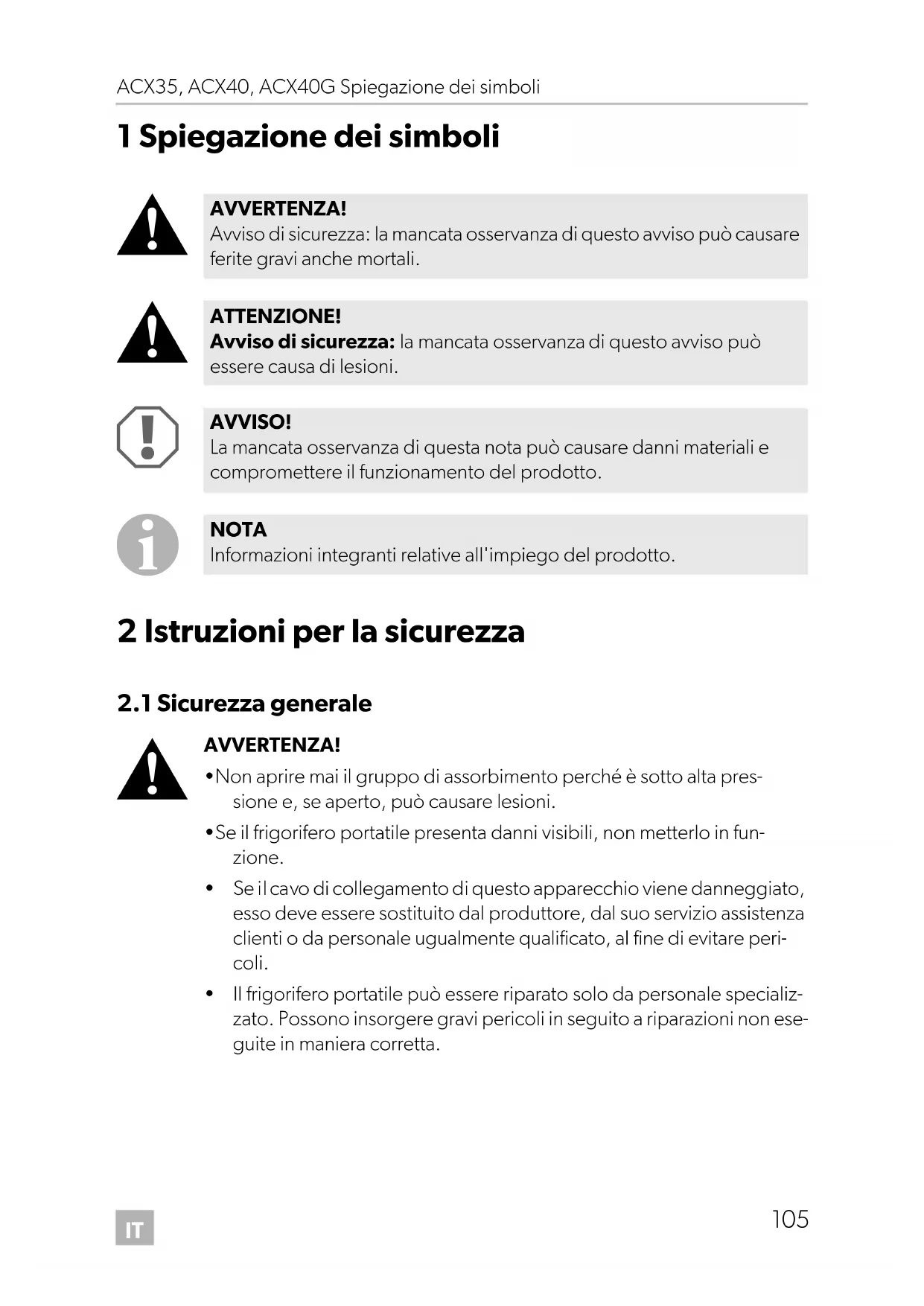 - Il frigorifero portatile può essere riparato solo da personale specializ- zato. Possono insorgere gravi pericoli in seguito a riparazioni non ese- guite in maniera corretta. AVVERTENZA! Avviso di sicurezza: la mancata osservanza di questo avviso può causare ferite gravi anche mortali. ATTENZIONE! Avviso di sicurezza: la mancata osservanza di questo avviso può essere causa di lesioni. AVVISO! La mancata osservanza di questa nota può causare danni materiali e compromettere il funzionamento del prodotto. NOTA Informazioni integranti relative all'impiego del prodotto. ACX35-ACX40-ACX40G-O-15s.book Seite 105 Freitag, 22. September 2017 6:24 18IT Istruzioni per la sicurezza ACX35, ACX40, ACX40G