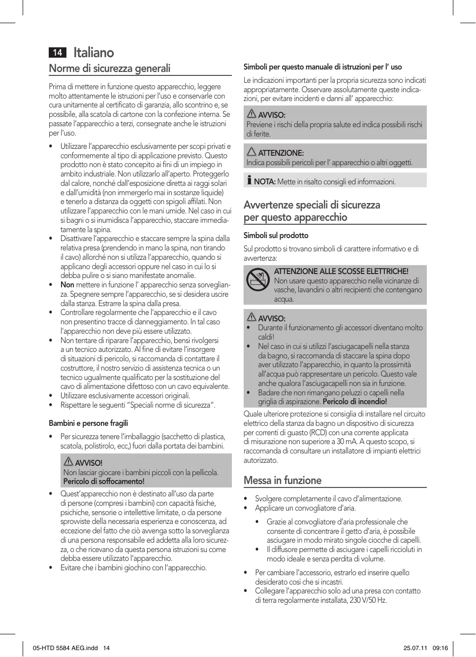 - Evitare che i bambini giochino con l’apparecchio. 05-HTD 5584 AEG.indd 14 Simboli per questo manuale di istruzioni per l’ uso Le indicazioni importanti per la propria sicurezza sono indicati appropriatamente. Osservare assolutamente queste indicazioni, per evitare incidenti e danni all’ apparecchio: AVVISO: Previene i rischi della propria salute ed indica possibili rischi di ferite. ATTENZIONE: Indica possibili pericoli per l’ apparecchio o altri oggetti. NOTA: Mette in risalto consigli ed informazioni. Avvertenze speciali di sicurezza per questo apparecchio Simboli sul prodotto Sul prodotto si trovano simboli di carattere informativo e di avvertenza: Attenzione alle scosse elettriche! Non usare questo apparecchio nelle vicinanze di vasche, lavandini o altri recipienti che contengano acqua. AVVISO: