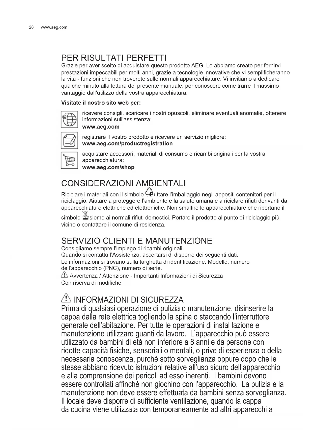 Grazie per aver scelto di acquistare questo prodotto AEG. Lo abbiamo creato per fornirvi prestazioni impeccabili per molti anni, grazie a tecnologie innovative che vi semplicheranno la vita - funzioni che non troverete sulle normali apparecchiature. Vi invitiamo a dedicare qualche minuto alla lettura del presente manuale, per conoscere come trarre il massimo vantaggio dall’utilizzo della vostra apparecchiatura. Visitate il nostro sito web per: ricevere consigli, scaricare i nostri opuscoli, eliminare eventuali anomalie, ottenere informazioni sull’assistenza: www.aeg.com registrare il vostro prodotto e ricevere un servizio migliore: www.aeg.com/productregistration acquistare accessori, materiali di consumo e ricambi originali per la vostra apparecchiatura: www.aeg.com/shop CONSIDERAZIONI AMBIENTALI Riciclare i materiali con il simbolo . Buttare l’imballaggio negli appositi contenitori per il riciclaggio. Aiutare a proteggere l’ambiente e la salute umana e a riciclare riuti derivanti da apparecchiature elettriche ed elettroniche. Non smaltire le apparecchiature che riportano il simbolo insieme ai normali riuti domestici. Portare il prodotto al punto di riciclaggio più vicino o contattare il comune di residenza.