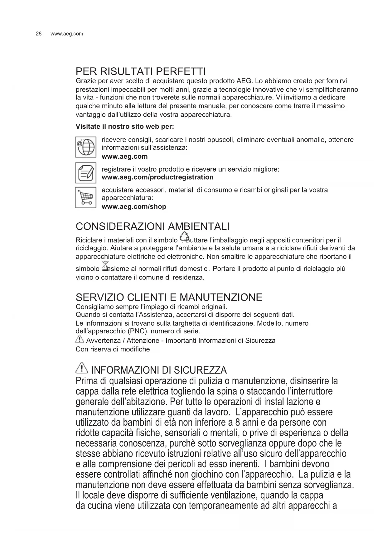 Per quanto riguarda le misure tecniche e di sicurezza da adottare per lo scarico dei fumi attenersi strettamente a quanto previsto dai regolamenti delle autorità locali competenti. L’aria aspirata non deve essere convogliata in un condotto usato per lo scarico dei fumi prodotti da apparecchi a combustione di gas o di altri combustibili. Non utilizzare o lasciare la cappa priva di lampade correttamente montate per possibile rischio di scossa elettrica. Mai utilizzare la cappa senza griglia correttamente montata! La cappa non va MAI utilizzata come piano di appoggio a meno che non sia espressamente indicato. Utilizzare solo le viti di ssaggio in dotazione con il prodotto per l’installazione o, se non in dotazione, acquistare il tipo di viti corretto. Utilizzare la lunghezza corretta per le viti che sono identicati nella Guida all’installazione. In caso di dubbio, consultare il centro di assistenza autorizzato o personale qualicata similare. ATTENZIONE! La mancata installazione di viti e dispositivi di fissaggio in conformità di queste istruzioni può comportare rischi di natura elettrica.www.aeg.com