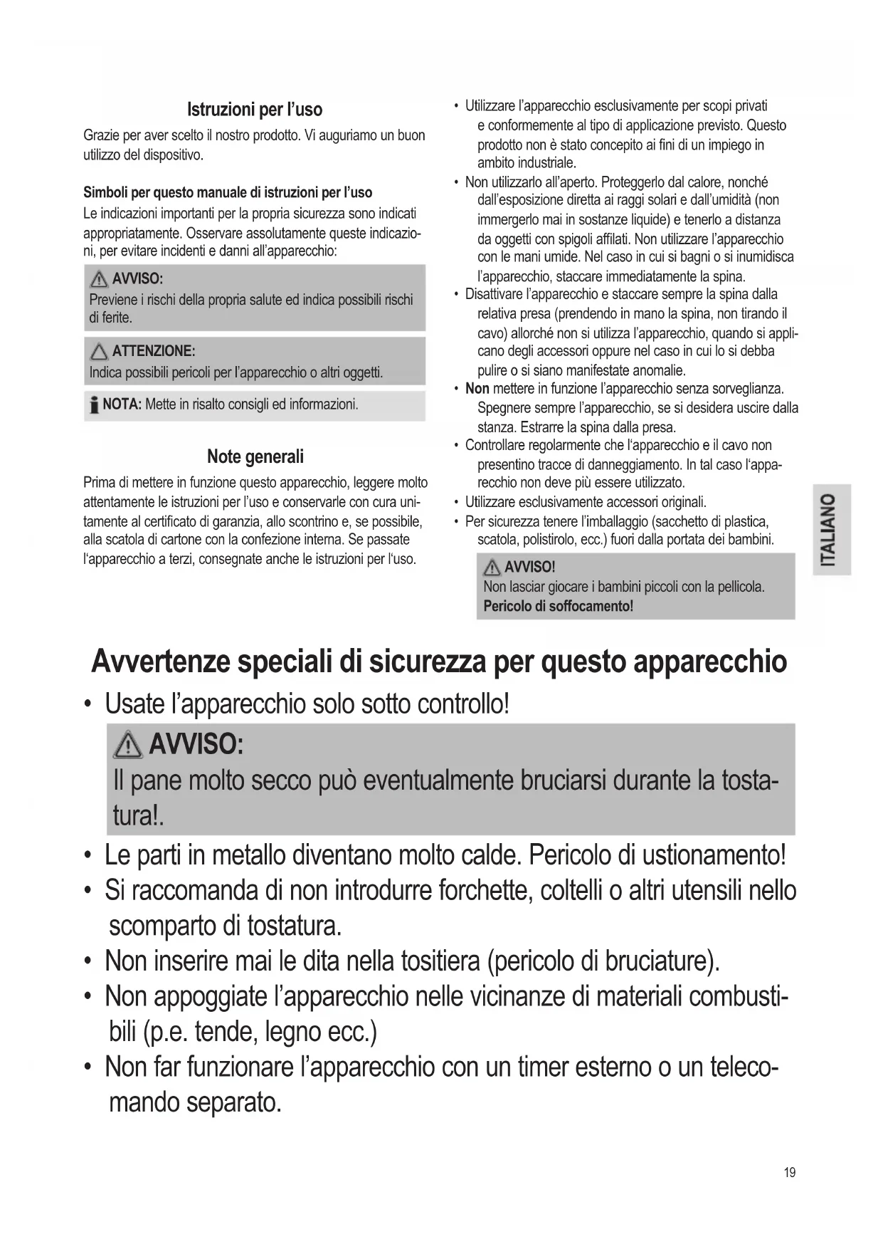 - Si raccomanda di non introdurre forchette, coltelli o altri utensili nelle scomparto di tostatura.