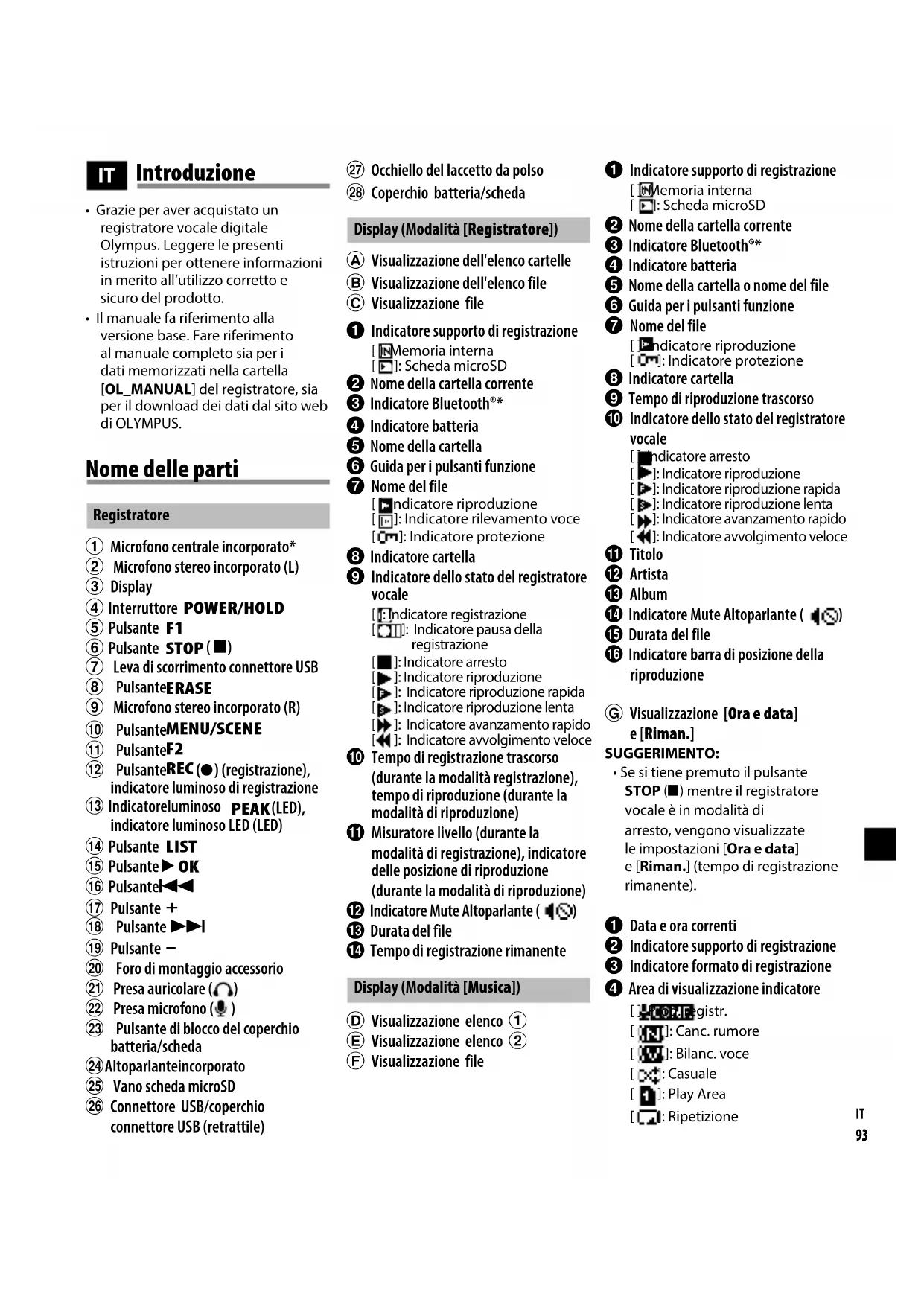 - Il manuale fa riferimento alla versione base. Fare riferimento al manuale completo sia per i dati memorizzati nella cartella [OL_MANUAL] del registratore, sia per il download dei dati dal sito web diOLYMPUS. Introduzione