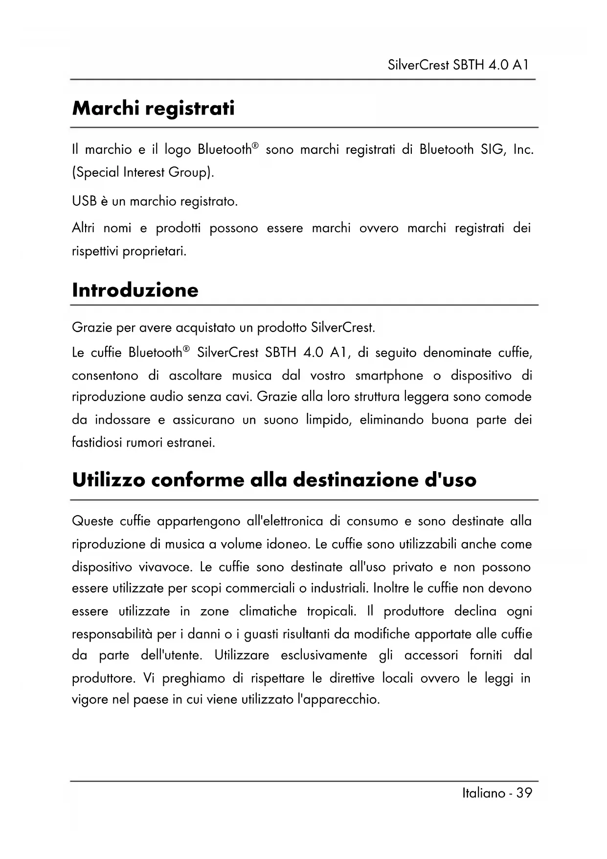 sono marchi registrati di Bluetooth SIG, Inc. (Special Interest Group). USB è un marchio registrato. Altri nomi e prodotti possono essere marchi ovvero marchi registrati dei rispettivi proprietari. Introduzione Grazie per avere acquistato un prodotto SilverCrest. Le cuffie Bluetooth