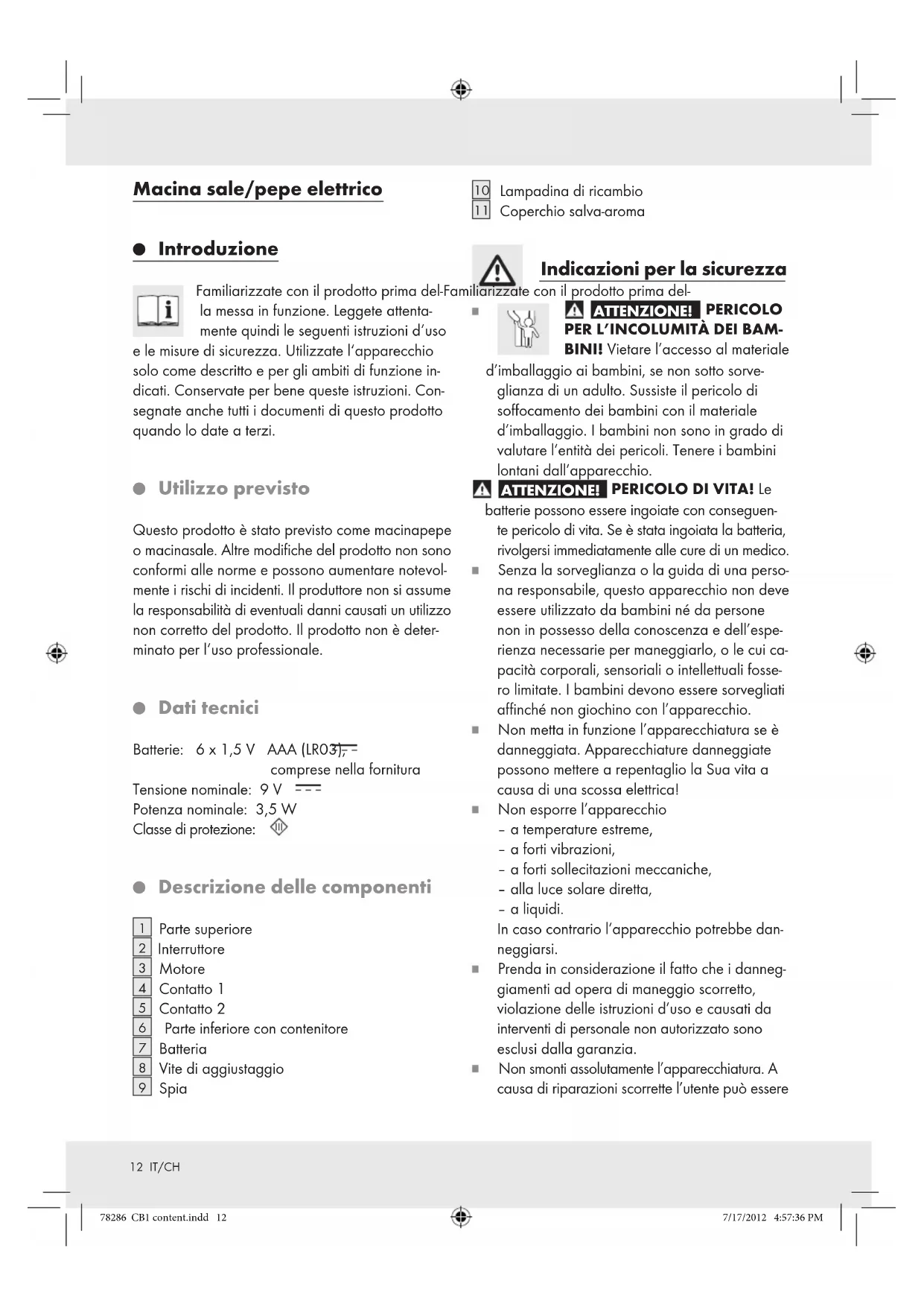 BINI! Vietare l’accesso al materiale d’imballaggio ai bambini, se non sotto sorve- glianza di un adulto. Sussiste il pericolo di soffocamento dei bambini con il materiale d’imballaggio. I bambini non sono in grado di valutare l’entità dei pericoli. Tenere i bambini lontani dall’apparecchio. ATTENZIONE! PERICOLO DI VITA! Le batterie possono essere ingoiate con conseguen- te pericolo di vita. Se è stata ingoiata la batteria, rivolgersi immediatamente alle cure di un medico. Senza la sorveglianza o la guida di una perso- na responsabile, questo apparecchio non deve essere utilizzato da bambini né da persone non in possesso della conoscenza e dell’espe- rienza necessarie per maneggiarlo, o le cui ca- pacità corporali, sensoriali o intellettuali fosse- ro limitate. I bambini devono essere sorvegliati affinché non giochino con l’apparecchio. Non metta in funzione l’apparecchiatura se è danneggiata. Apparecchiature danneggiate possono mettere a repentaglio la Sua vita a causa di una scossa elettrica! Non esporre l’apparecchio – a temperature estreme, – a forti vibrazioni, – a forti sollecitazioni meccaniche, – alla luce solare diretta, – a liquidi. In caso contrario l’apparecchio potrebbe dan- neggiarsi. Prenda in considerazione il fatto che i danneg- giamenti ad opera di maneggio scorretto, violazione delle istruzioni d’uso e causati da interventi di personale non autorizzato sono esclusi dalla garanzia. Non smonti assolutamente l’apparecchiatura. A causa di riparazioni scorrette l’utente può essere 78286 CB1 content.indd 12 7/17/2012 4:57:36 PM13 IT/CH esposto a gravi pericoli. Faccia eseguire le riparazioni da personale qualificato. Mantenete il prodotto sempre pulito. Riempire il macinino per sale e pepe solamente con pepe in grani oppure sale grosso. IDONEO PER ALIMENTI! Le ca- ratteristiche del sapore e dell‘odore non ven gono pregiudicate dal prodotto. Indicazioni di sicurezza per le batterie Rimuovere dall’apparecchio le batterie non utilizzate per parecchio tempo.