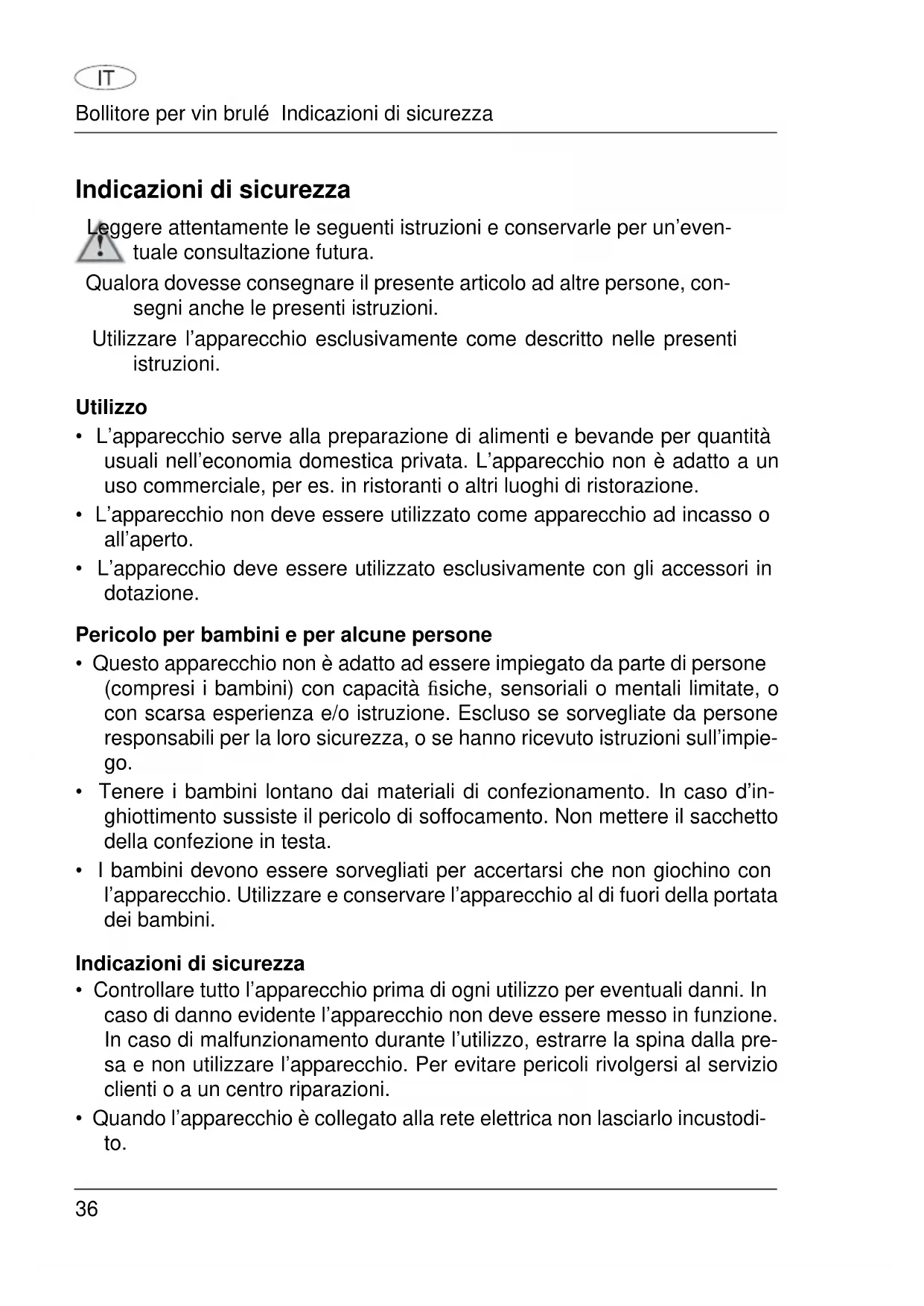 - Bollitore per vin brulé • Griglia per conserve • Istruzioni all’uso • Certifi cato di garanzia La preghiamo di rivolgersi al servizio di assistenza qualora uno dei compo- nenti sopra citati non fosse compreso nel volume di fornitura. Bollitore per vin brulé Indice / Simboli / Volume di fornitura36 Indicazioni di sicurezza Leggere attentamente le seguenti istruzioni e conservarle per un’even- tuale consultazione futura. Qualora dovesse consegnare il presente articolo ad altre persone, con- segni anche le presenti istruzioni. Utilizzare l’apparecchio esclusivamente come descritto nelle presenti istruzioni. Utilizzo