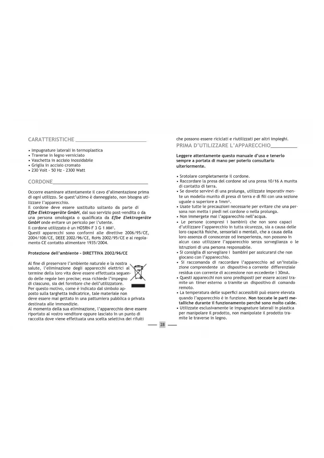 - 230 Volt - 50 Hz - 2300 Watt CORDONE___________________________________________ Occorre esaminare attentamente il cavo d’alimentazione prima di ogni utilizzo. Se quest’ultimo è danneggiato, non bisogna uti- lizzare l’apparecchio. Il cordone deve essere sostituito soltanto da parte di Efbe Elektrogeräte GmbH, dal suo servizio post-vendita o da una persona omologata o qualicata da Efbe Elektrogeräte GmbH onde evitare un pericolo per l’utente. Il cordone utilizzato è un HO5RN-F 3 G 1 MM². Questi apparecchi sono conformi alle direttive 2006/95/CE, 2004/108/CE, DEEE 2002/96/CE, RoHs 2002/95/CE e al regola- mento CE contatto alimentare 1935/2004. Protezione dell’ambiente – DIRETTIVA 2002/96/CE Al ne di preservare l’ambiente naturale e la nostra salute, l’eliminazione degli apparecchi elettrici al termine della loro vita deve essere effettuata seguen- do delle regole ben precise; essa richiede l’impegno di ciascuno, sia del fornitore che dell’utilizzatore. Per questo motivo, come è indicato dal simbolo ap- posto sulla targhetta indicatrice, tale materiale non deve essere mai gettato in una pattumiera pubblica o privata destinata alle immondizie. Al momento della sua eliminazione, l’apparecchio deve essere riportato al vostro venditore oppure lasciato in un punto di raccolta dove viene effettuata una scelta selettiva dei rifuiti che possono essere riciclati e riutilizzati per altri impieghi.