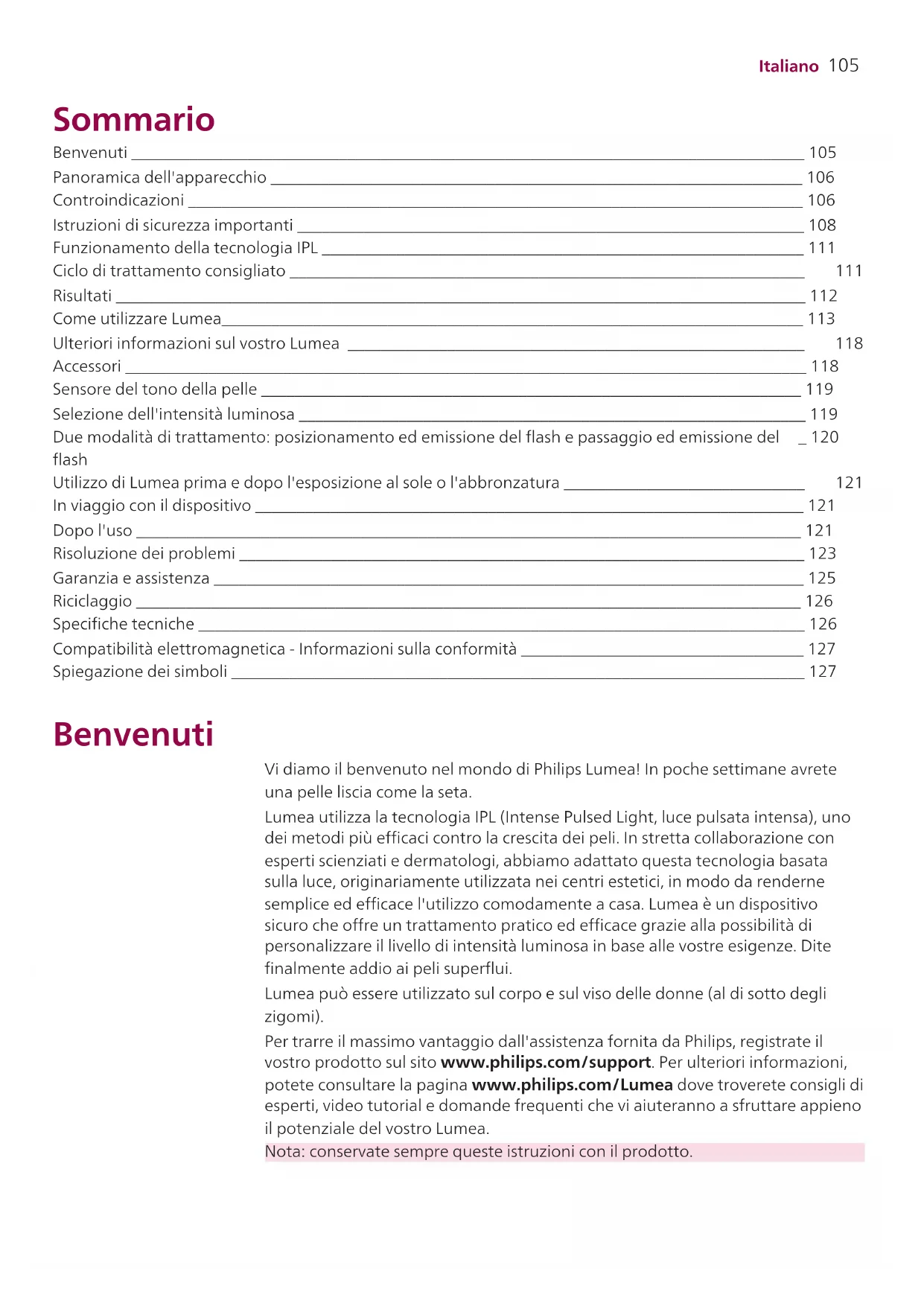 Italiano Sommario Benvenuti _________________________________________________________________________________ 105 Panoramica dell'apparecchio ________________________________________________________________ 106 Controindicazioni __________________________________________________________________________ 106 Istruzioni di sicurezza importanti _____________________________________________________________ 108 Funzionamento della tecnologia IPL __________________________________________________________ 111 Ciclo di trattamento consigliato ______________________________________________________________ 111 Risultati ___________________________________________________________________________________ 112 Come utilizzare Lumea______________________________________________________________________ 113 Ulteriori informazioni sul vostro Lumea _______________________________________________________ 118 Accessori __________________________________________________________________________________ 118 Sensore del tono della pelle _________________________________________________________________ 119 Selezione dell'intensità luminosa _____________________________________________________________ 119 Due modalità di trattamento: posizionamento ed emissione del flash e passaggio ed emissione del flash _ 120 Utilizzo di Lumea prima e dopo l'esposizione al sole o l'abbronzatura _____________________________ 121 In viaggio con il dispositivo __________________________________________________________________ 121 Dopo l'uso ________________________________________________________________________________ 121 Risoluzione dei problemi ____________________________________________________________________ 123 Garanzia e assistenza _______________________________________________________________________ 125 Riciclaggio ________________________________________________________________________________ 126 Specifiche tecniche _________________________________________________________________________ 126 Compatibilità elettromagnetica - Informazioni sulla conformità __________________________________ 127 Spiegazione dei simboli _____________________________________________________________________ 127 Benvenuti Vi diamo il benvenuto nel mondo di Philips Lumea! In poche settimane avrete una pelle liscia come la seta. Lumea utilizza la tecnologia IPL (Intense Pulsed Light, luce pulsata intensa), uno dei metodi più efficaci contro la crescita dei peli. In stretta collaborazione con esperti scienziati e dermatologi, abbiamo adattato questa tecnologia basata sulla luce, originariamente utilizzata nei centri estetici, in modo da renderne semplice ed efficace l'utilizzo comodamente a casa. Lumea è un dispositivo sicuro che offre un trattamento pratico ed efficace grazie alla possibilità di personalizzare il livello di intensità luminosa in base alle vostre esigenze. Dite finalmente addio ai peli superflui. Lumea può essere utilizzato sul corpo e sul viso delle donne (al di sotto degli zigomi). Per trarre il massimo vantaggio dall'assistenza fornita da Philips, registrate il vostro prodotto sul sito www.philips.com/support. Per ulteriori informazioni, potete consultare la pagina www.philips.com/Lumea dove troverete consigli di esperti, video tutorial e domande frequenti che vi aiuteranno a sfruttare appieno il potenziale del vostro Lumea. Nota: conservate sempre queste istruzioni con il prodotto.106 Italiano Panoramica dell'apparecchio 1 Finestra di emissione della luce (con filtro UV integrato) 2 Accessori a Accessorio corpo b Accessorio viso (SC1997, SC1998 e SC1999) c Accessorio zona bikini (SC1998, SC1999) 3 Riflettore all'interno dell'accessorio 4 Sistema di sicurezza integrato 5 Sensore del tono della pelle 6 Contatti elettrici 7 Pulsante per l'emissione flash 8 Apertura per contatti elettrici 9 Pulsante on/off e di impostazione dell'intensità luminosa 10 Spie di intensità 11 Spia di "luce pronta" 12 Fori di ventilazione 13 Presa dispositivo 14 Adattatore 15 Spinotto 16 Custodia morbida (non illustrato) 17 Panno per la pulizia (non illustrato) Controindicazioni Condizioni Non utilizzate il dispositivo: