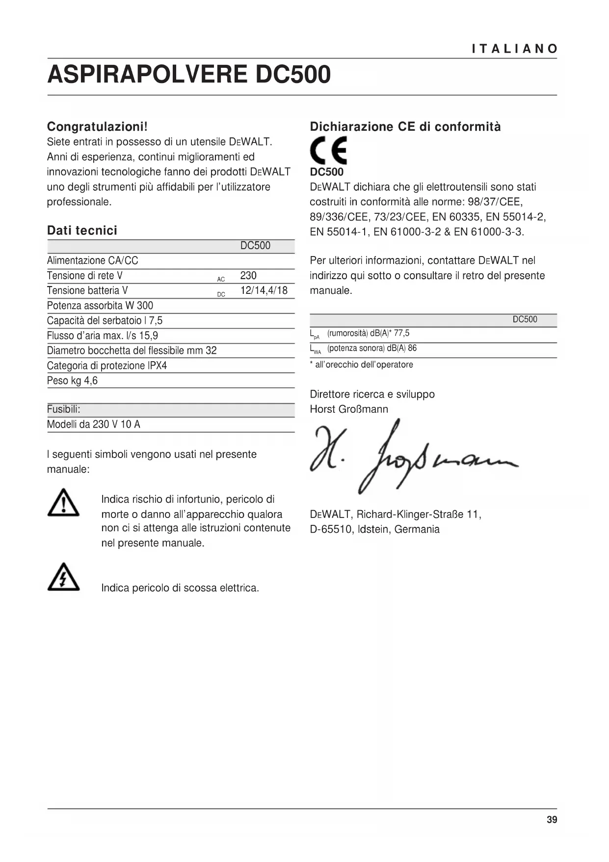 12/14,4/18 Potenza assorbita W 300 Capacità del serbatoio l 7,5 Flusso d’aria max. l/s 15,9 Diametro bocchetta del flessibile mm 32 Categoria di protezione IPX4 Peso kg 4,6 Fusibili: Modelli da 230 V 10 A I seguenti simboli vengono usati nel presente manuale: Indica rischio di infortunio, pericolo di morte o danno all’apparecchio qualora non ci si attenga alle istruzioni contenute nel presente manuale. Indica pericolo di scossa elettrica. Dichiarazione CE di conformità DC500 DEWALT dichiara che gli elettroutensili sono stati costruiti in conformità alle norme: 98/37/CEE, 89/336/CEE, 73/23/CEE, EN 60335, EN 55014-2, EN 55014-1, EN 61000-3-2 & EN 61000-3-3. Per ulteriori informazioni, contattare DEWALT nel indirizzo qui sotto o consultare il retro del presente manuale. DC500